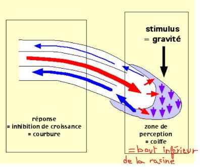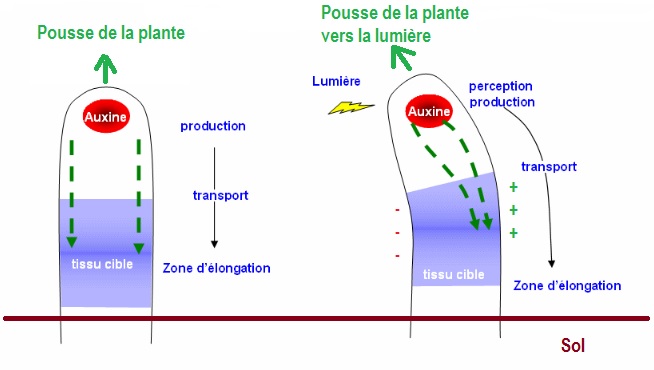 Oui, les plantes poussent vers la lumière. Mais elles utilisent aussi la gravité Phénomène rigolo 1 : Croissance vers la lumière : - Imagine une herbe qui pousse. Elle doit aller là ou y ade la lumiere. - Pour ca, les cellules du coté de l'herbe qui recoit plus de lumière vont diminuer leur croissance. - Les cellules qui sont du coté de l'herbe qui recoit moins de lumière vont grandir plus vite. => Ca "tord" donc l'herbe, ca la fait pencher vers le coté qui a le plus de soleil ![]() Phénomène rigolo 2 : Croissance des racines vers la gravité : - Les cellules de la toute première pousse qui sort de la graine sont dans la terre, donc ne détectent pas la lumière pour s'orienter. - Ces cellules contiennent des espèces de petits "sacs". Dans ces sacs il y a un petit élément massique. Selon la gravité, cet élément tombe d'un coté ou l'autre dans ce sac. La plante en déduit l'orientation de la gravité, et donc l'orientation de l'axe haut-bas - La jeune pousse va alors se diriger vers le haut ![]()