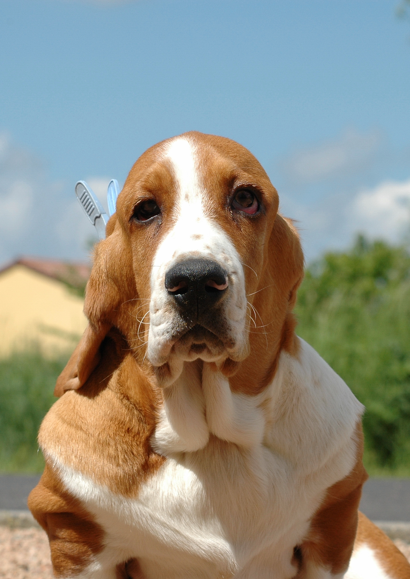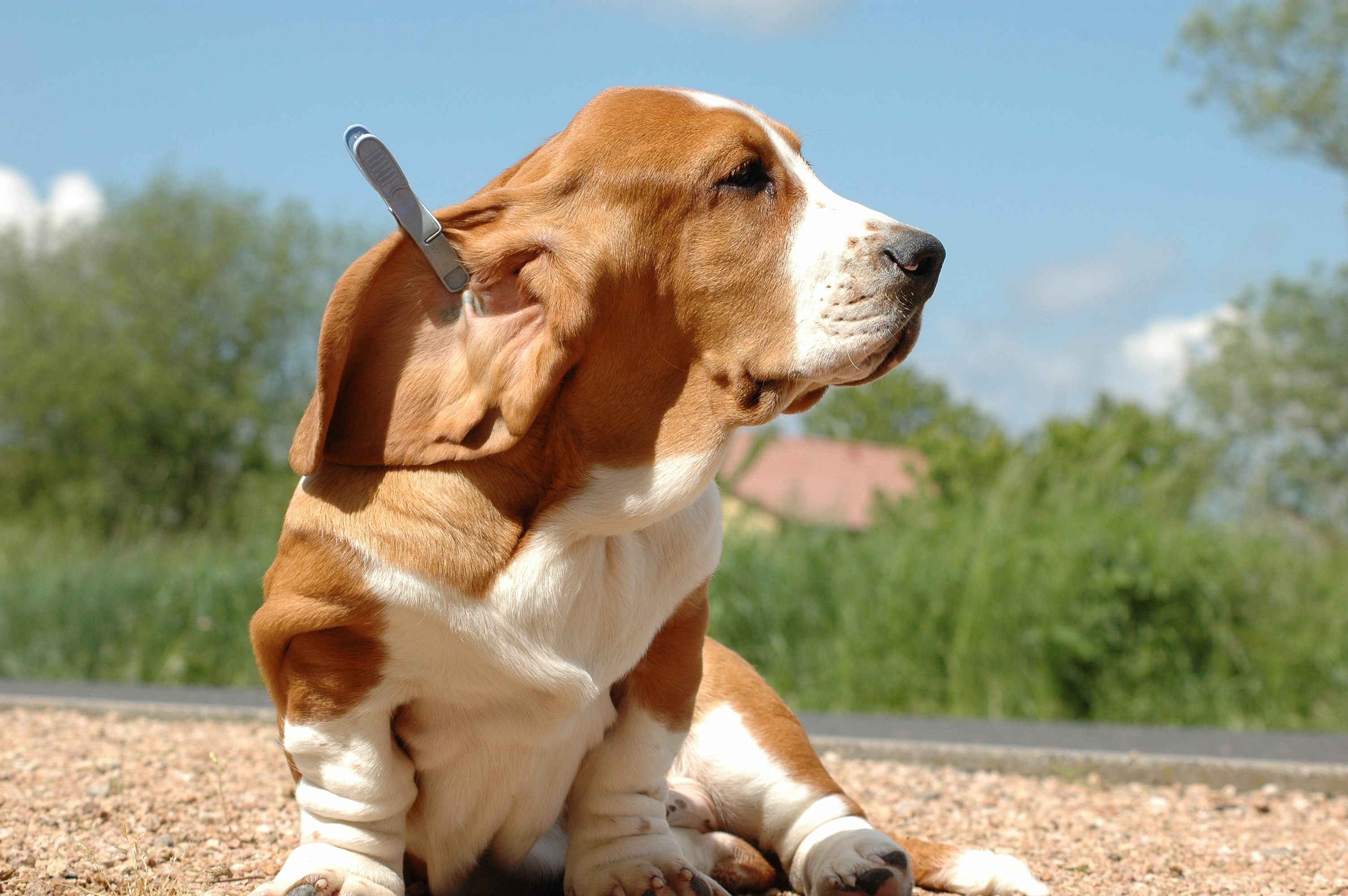 C'est des problèmes techniques avec ce clébard....C'est comme la pince a linge qui lui tient les oreilles pour pas les mettre dans la gamelle d'eau ou la bouffe ou dans la merdasse quand il marche.... Mais la aussi, si ça marche quand la tête est droite, dés qui se penche la tête en avant, c'est a dire tout le temps dans les situations cités plus haut, il a la pince qui tombe sur le museau et ça lui fait un loup avec les oreilles!