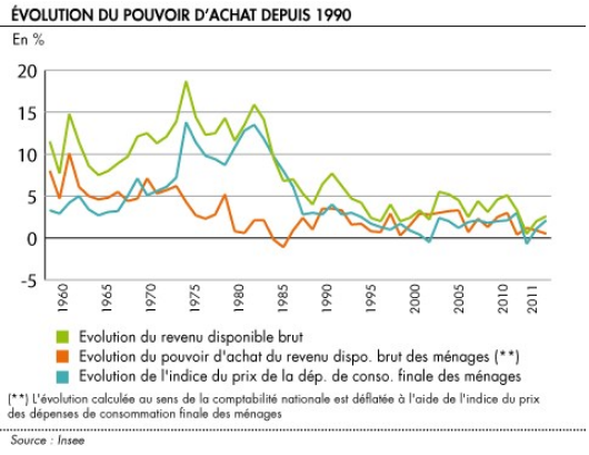 Ouai j'en sais rien. Me demandais sur la TVA, si elle augmente : -> Soit les vendeurs augmente du meme delta les produits qu'ils vendent, ca fait augmenter le prix de tous les trucs qu'on achète (sauf produits première necessité), et du coup au final ca entraine une augmentation générale des prix = inflation et finalement l'Etat gagne pas plus. -> Soit les vendeurs gardent le meme prix de vente mais font moins de marge dessus, donc ca impacte que les "riches" vendeurs, pas les "pauvres" consommateurs Citation : je critique surtout les RICHES si tu vois ce que je veux ;) Ah je comprends. Donc ce que tu dis là c'est que tu critique les RICHES mais c'est ce que tu veux etre aussi ? Je dec, oui je vois j'imagine. Les grands riches qui bossent pas et investissent juste leur argent dans des villas (donc argent perdu pour les autres citoyens) ou dans les ouvres d'art (donc argent perdu pour les autres) ou dans les actions (donc là dans les industries donc bien). Ou qui planquent leur argent hors de France pour l'investir mais donc dans d'autres pays et ne pas payer d'impot dessus (ou peu). La y a soit fraude fiscale, interdit point barre. Soit optimisation fiscale par x manière que je ne connais pas, mais dans ce cas là c'est pas necessairement frauduleux ou interdit Citation : Encore une fois, je t'assure qu'il y a un gros problème de répartition des richesses et je parle pas de ceux qui gagne 80000€ par mois. Je parle des gros très gros poissons. J'en sais rien. Je reste douteux sur ca. - Alors certe y a de plus en plus d'inegalités de pognon dans les pays de l'OCDE. Mais est-ce un problème ? C'est peut etre meme un bon indicateur. De l'argent qui s'accumule sur des mecs qui ont fait fortune dans le pétrole, nouvelles technologies etc. Je ne suis pas sur que ce soit du pognon qui a été enlevé de la main des pauvres. Ca montre peut etre que l'économie est dynamique, y a des nouveaux marchés qui se créent avec des petits malins qui arrivent a sauter sur l'occas pour se faire un max de pognon (Google, Amazon, facebook, pharma, petrole etc etc) - De plus il me semble qu'en meme temps y a de plus en plus de pouvoir d'achat pour tout le monde (cf graph dessous pour la France, en continuelle augmentation depuis 1960) Donc je me demande si ca voudrait pas dire que ca gène/pose question que des gens gagnent et possèdent énormément (des milliards), meme si le pouvoir d'achat augmente pour tout le monde en fait. Je te dis ca j'y connais pas grand chose, je creuse pas les sujets spécialement, je suis juste méfiant du "c'est la crise", "ca va de pire en pire". Tu lis un journal d'il y a 40 ans, c'était pareil "c'est la crise" (parait-il, pas retrouvé après recherche rapide google news) ![]() (economie.gouv.fr)