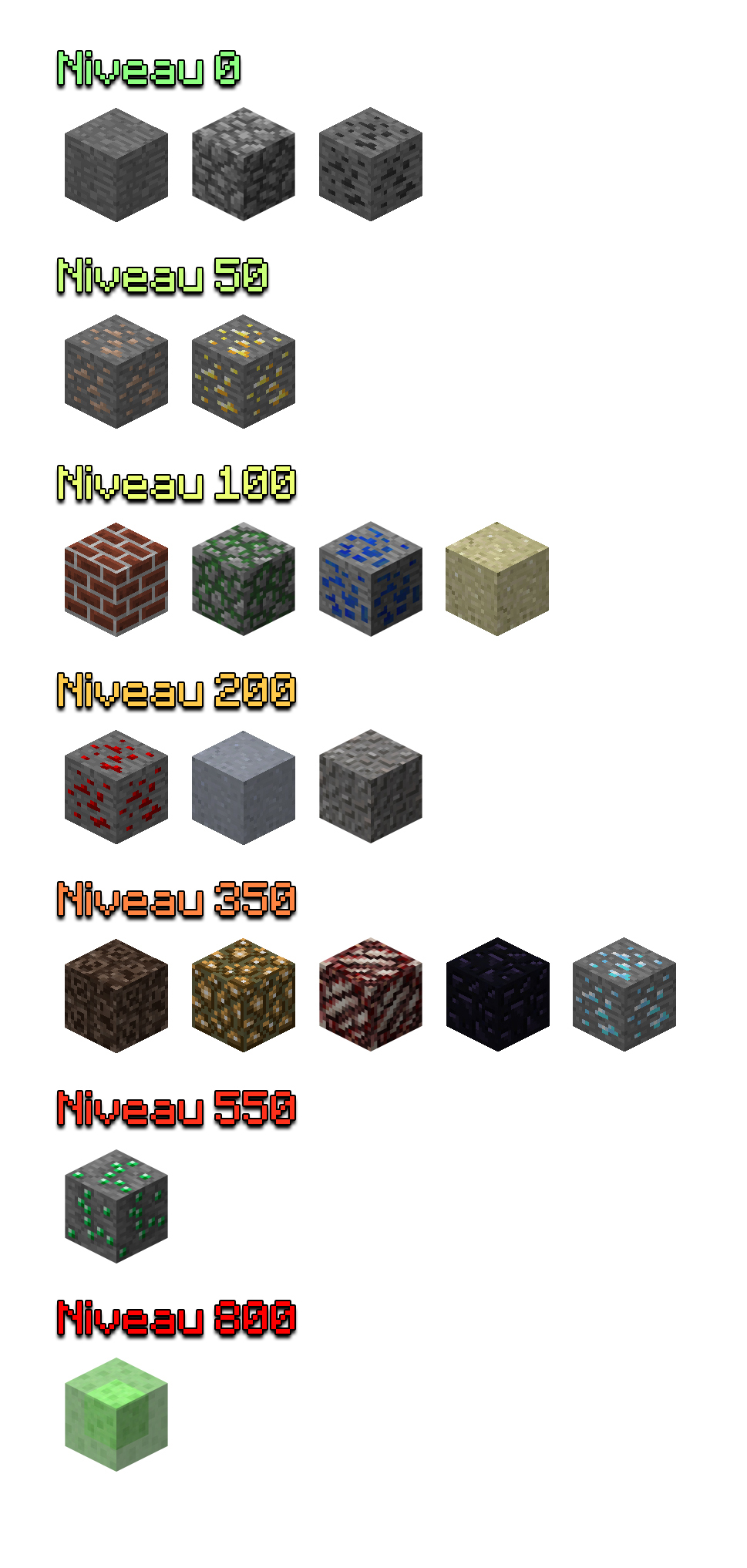 ![]() ![]() ![]() PLUGINS >> ASkyBlock MAP DYNAMIQUE Version du serveur : 1.12.2 Générateur de cobble Le générateur évolue en fonction du niveau de votre île Je ne précise bien évidemment pas le taux d'apparition de chaque ressources ('faut bien laisser une part de mystère) De plus, certains blocs peuvent être générés mais ne sont pas présents dans ce tableau ![]()