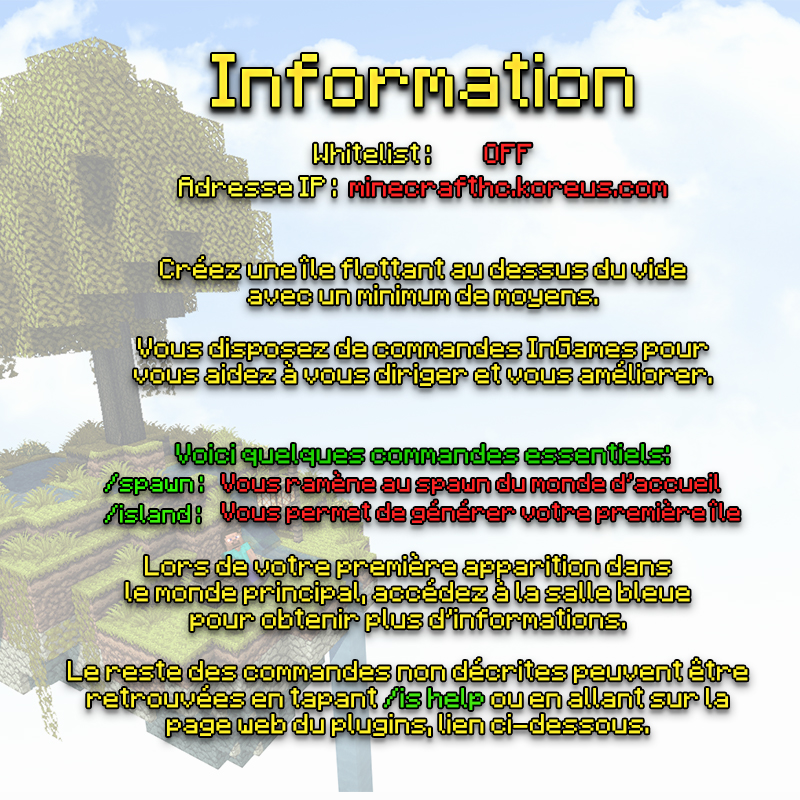 /is resetJe te suggère de prendre le duo d’iles plutot, pour commencer alors ![]() Vous pouvez consultez les maps ici: http://minecrafthc.koreus.com:8123/ (Map en temps réel!)