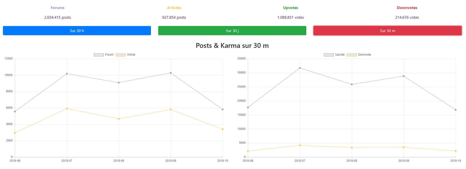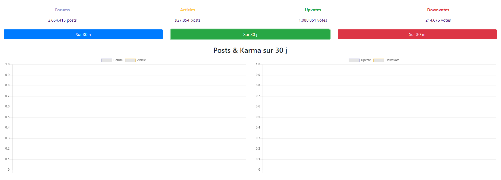 Nope ! Apparemment l'appli était down ou je sais pas quoi. Voir ce message et les suivants. Apparemment ça a été remis en bon ordre. Ça vient de moi, ou les statistiques sur "30j" et sur "30m" ne fonctionnent pas comme elles le devraient ? La stat 30 jours n'affiche rien : ![]() La stat 30 mois n'en affiche que 5, et de juin à septembre 2018 (pourquoi spécifiquement ces mois-là, ich weiss es nicht) : ![]()