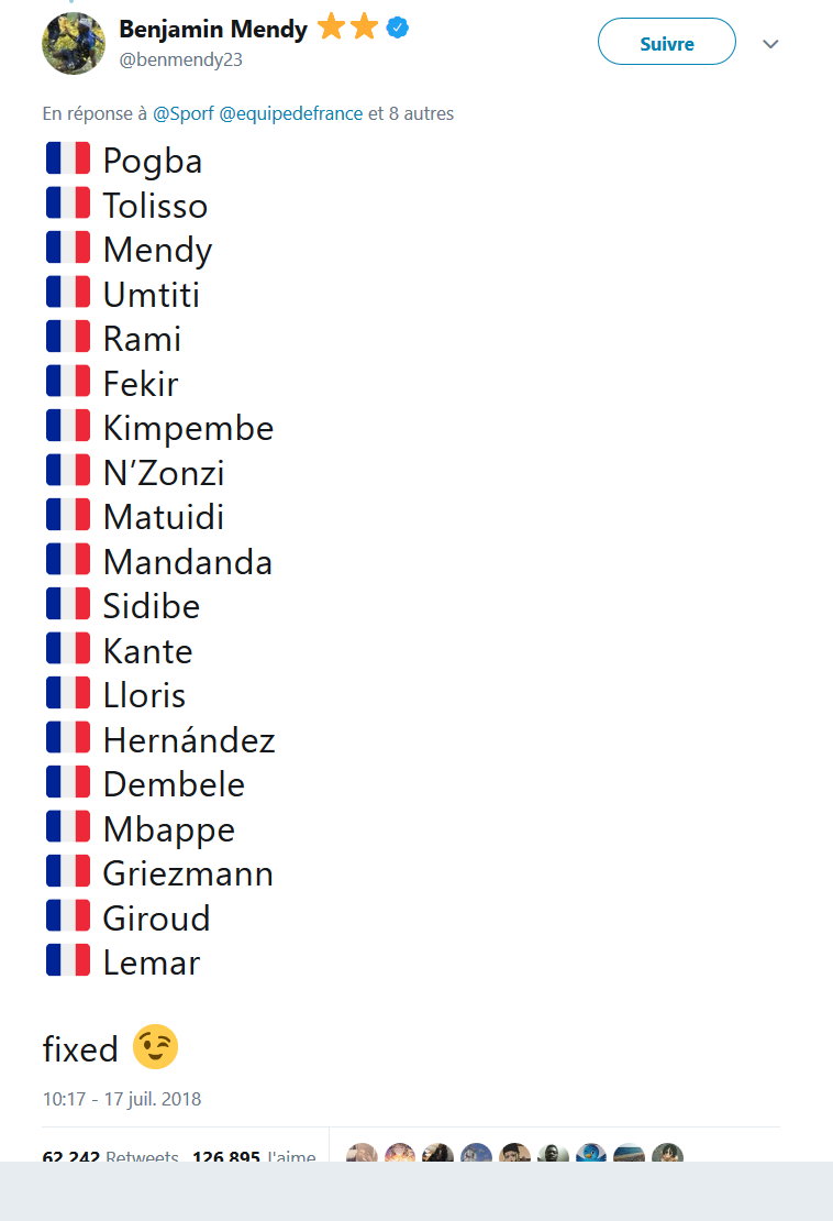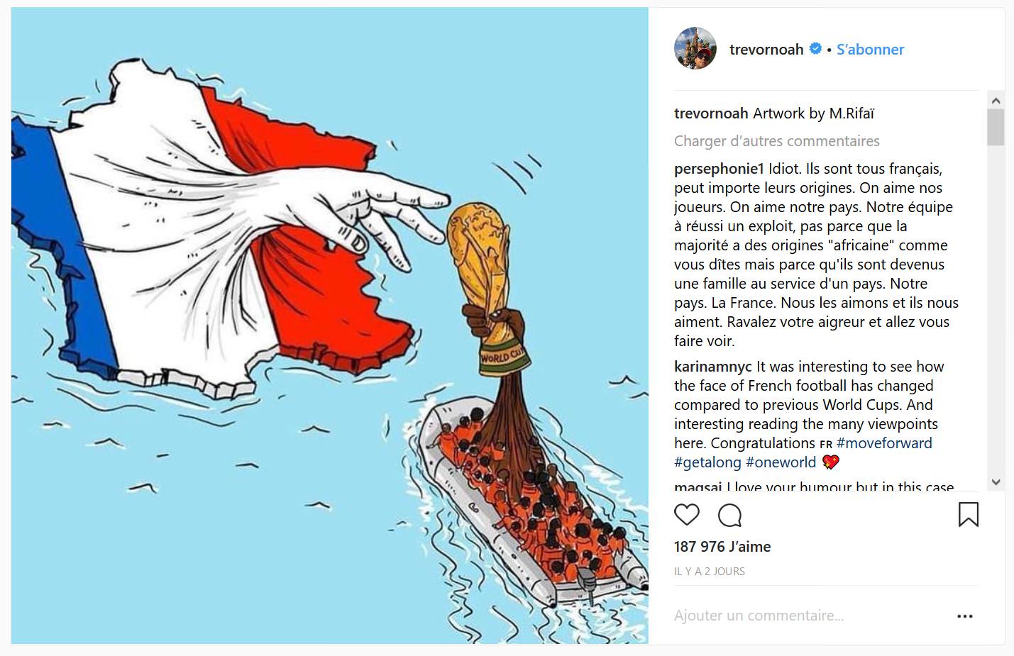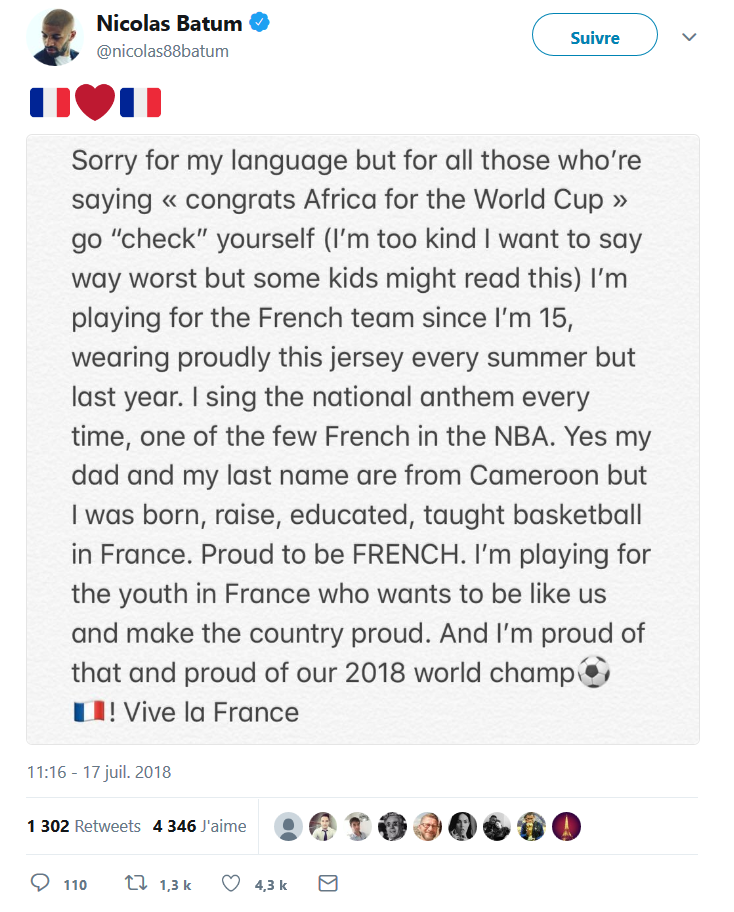 TONIGHT: Congratulations to Africa on winning the 2018 Men’s World Cup! https://t.co/ly1wxU1VzT Il y est allé de son "humour" sur instagram également: ![]() https://www.instagram.com/p/BlR01lsHfOm/ Mais il est loin d'être le seul à dire que les joueurs de l'équipe de France sont africains avant d'être français et sous couvert de tolérance ne font que rappeler que ces joueurs n'ont de français que le maillot. Il y a aussi eu ce tweet: ![]() https://twitter.com/KhaledBeydoun/status/1018540593897705473 Et celui-ci: ![]() Qui a entrainé une réponse d'un des principaux intéressés: ![]() https://twitter.com/benmendy23/status/1019269986282598403 Nicolas Batum, joueur français de NBA a aussi dégainé: ![]() https://twitter.com/nicolas88batum/status/1019284803118608390 Et pour résumer l'ensemble, il y a ce post sur reddit: https://www.reddit.com/r/soccer/comments/8zqayx/a_french_perspective_on_the_whole_france_is_an/