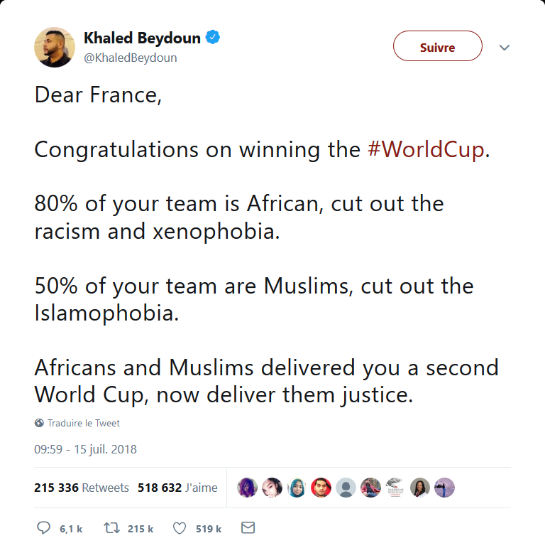 Je me suis aussi fait cette réflexion. Idem pour le tweet de Khaled A. Beydoun qui est un islamologue américain L'ironie que j'ai constaté c'est que la majorité des posts facebook que j'ai vu à ce sujet ont été (re)posté par des amis antifa ou antiracistes. Un peu comme ces exemples médiatiques. Du coup, j'ai du mal à comprendre cette logique d'exacerber les différences pour ensuite les nier dans un autre discours. On réduit une personne noire à sa couleur de peau, à son origine ou à sa religion pour mieux critiquer ceux qui font de même ou au nom d'une cause plus grande. "Vous avez vu les racistes ? C'est des noirs qui ont gagné !" pourrait-on caricaturer. Que des idiots puissent s'en attrister, tout le monde crierait à juste titre au scandale. Mais là, que ce soit repris et utilisé par justement ceux qui ne devraient PAS le relever, ça j'ai du mal à le saisir tellement c'est contre-productif. Et je déteste le deux-poids, deux-mesures.