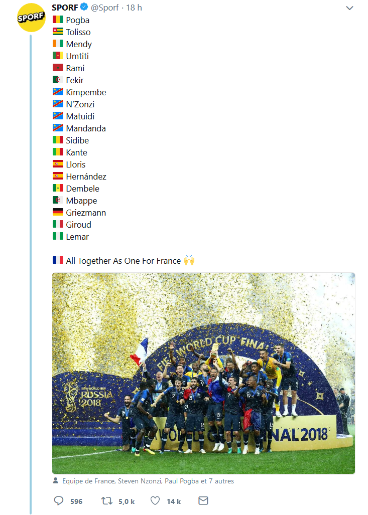 C'est triste, on a enfin quelque chose qui nous unit tous, l'intégration des familles réussis sur 1 ou 2 génération, rien à dire, et les mecs s'approprient le truc pour dire qu'on devrait remercier l’Afrique pour la coupe ? what the fuck ??