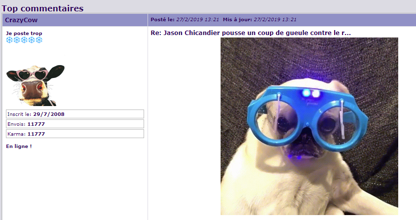 Nan j'déconne ! (en fait pas tant que ça) Ben écoute, c'est toujours un plaisir de communiquer avec des êtres de sa propre espèce, à la revoyotte ![]() Et félicitation pour tes 5000 points de karma, on se rappel à 10k PS : Ah non oups, c'est 5k messages seulement, toi aussi t'as un karma négatif, bah GG quand même