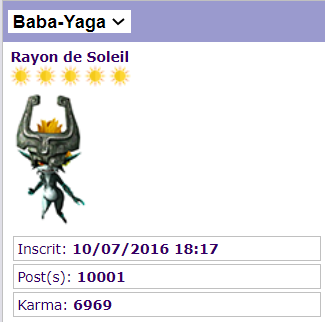 Et parce que j'avais loupé la photo des 9000, voici la photo des 10 000 ! ![]() Bon 10 001 posts, MAIS avec un karma sympa ^^ PS : Et bravo pour avoir géré trop bien de ce que j'ai vu le dernier Koreus Award !