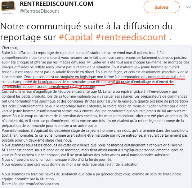 Je comprend donc que vous n'avez jamais mis les pieds dans un vrai job de merde. Quand on fait 10h de boulot au domac, au starbuck, au amazon, ou autre, il n'y a pas d'autre temps que le rush, car même quand il n'y a pas de client il y a un mec pour te crier dessus d’accélérer. quand on fait 10h de boulot dans ces jobs de merde, tu reste debout toute la journée, et n'est autorisé à t'assoir que pendant les 30 minutes de pause au milieu de la journée (oui oui, 4h45 de boulot debout. pause de 30 minutes, puis 4h45 de boulot debout). On a ici un jeune homme, qui a 3 jours d'ancienneté. 3 jours putain, il est en putain de formation et il se fait engueulé de manière hyper sale devant les caméras. et pourquoi ? as t'il commis une faute ? non, il n'as commis aucune faute, il a juste posé une enveloppe à côté de la boite au lieu de dans la boite. Aurai t'il ensuite oublié de la mettre a l'intérieur avant de finir son carton ? et bien, on en sait rien, comme il le dit lui même "c'est pour que ça rentre mieux après", autrement dit : il n'as pas fini de préparer le colis et a encore des choses à mettre à l'intérieur. aujourd'hui dans ce genre de boulot, tu te fais engueuler pour des conneries "dans la caisse, rangez les pièces de gauche à droite", "placez l'étiquette DLC sur le côté gauche de l'assiette", "placez les boissons au centre du plateau", "placez les serviettes dans le coin haut droit, pas le coin bas droit ! sinon je vous met une cartouche", "les fromages doivent être parallèles au bord du plateau", etc... etc... Dans un boulot, il y a 2 types de règles, les règles qui ont valeur de loi, les choses qui, si elles ne sont pas respectés constituent une faute (ne pas mettre tout les produits dans une commande, ne pas rendre toute la monnaie, ne pas respecter les règles de sécurités, etc...) et il y a des règles qui sont des préférences personnelles. Pour ces règles là il n'y a aucune vérité absolue, que des profils différents et chacun a le siens. Certains trouvent que faire le ménage c'est prioritaire par rapport à ranger les stocks. Certains préfèrent mettre les boissons froides en bord de plateau pour que les frites puissent ne pas être en contact. Si un employeur ne se sent plus péter au point de venir vous faire chier sur des règles comme celle là, pour imposer ses habitudes et surtout être violent dans sa com', faut pas vous étonner que ça fasse réagir. D'autant plus que par définition, l'employeur n'y met plus les pieds depuis des années sur les postes où il viens imposer ses habitudes de travail. Et parfois ces habitudes vont même à l'encontre de tes obligations contractuelles.