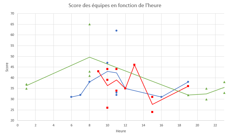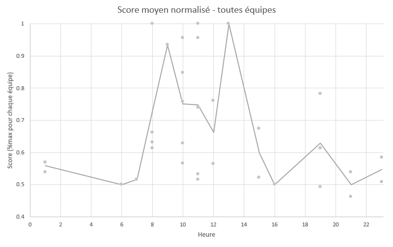 Intéressant, merci ! On peut en tirer quelques autres graphiques. Score des bleus, rouges et verts en fonction de l'heure (ronds, carrés, triangles, pour les daltoniens) : Je ne compte pas les weekends, uniquement les jours de semaine. Les lignes représentent la moyenne. ![]() Observation : l'équipe verte est tombée sur des créneaux 2 fois plus étalés que les rouges. Il faudra que la partie dure plus longtemps pour voir une répartition plus homogène dans les créneaux. Scores horaires en mélangeant toutes les équipes : Le score de chaque équipe est normalisé par rapport à leur score maximal respectif. Je ne compte encore pas les weekends. ![]() Observation : Le score en "milieu" de journée (8h-14h) est très volatile, mais on constate que cette période reste globalement ~1.5x plus favorable (parfois même 2x) que la période allant de fin de l'après midi au petit matin (16h-8h)