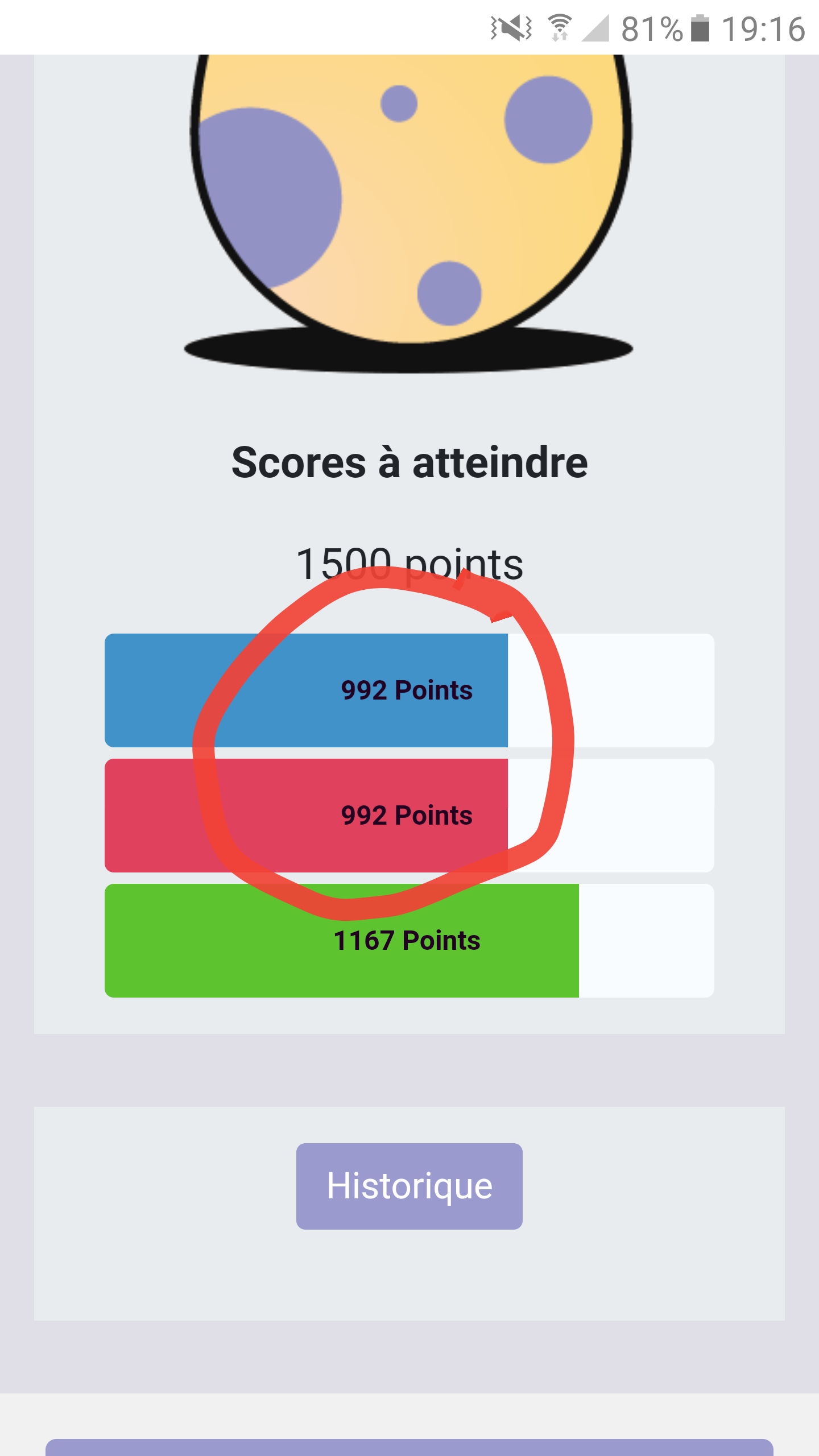 Citation : Le 12/06, on repasse Ă 15 comptabilisĂ©s + les rouges ratent leur crĂ©neau (comment c'est possible Ă 10h ? o_O), donc les 30 points d'avance sont reperdus et ça donne B993 vs R992 (avec un score nĂ©gatif sur la journĂ©e pour les rouges). Petite correction dans la chronologie des faits : Le 12/06 on monte briĂšvement Ă 17 comptabilisĂ©s vers 7h00 puis ont tombe brutalement Ă 15 comptabilisĂ©s avant 11h00 Et on peut mĂȘme ajouter que certaines poules qui avaient des points mais qui n'Ă©taient pas comptabilisĂ©es sont soudainement Ă©jectĂ©es du poulailler. Sur leur info membres leur score de la partie redescend Ă zĂ©ro mais les points engrangĂ©s durant la partie reste dans leur cumul