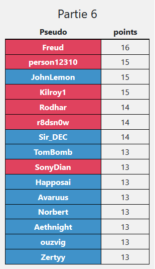 | Je poste trop    Inscrit: 18/02/2005 18:32 Post(s): 15826 Karma: 17002 | @Freud toujours 1er, mais du coup, il ne se sacrifie jamais pour trouver un créneau...  En faite le 1er dans le classement c'est celui qui en fait le moins...  Pas taper Freud