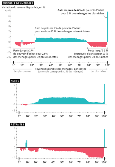 Source ? Et comme ca ca me parait normal que les salaires stagnent (cad s'alignent sur l'inflation quoi). Des salaires qui augmenteraient pour tout le monde, ca entrainerait juste une hausse des prix de tout, donc de l'inflation. Non ? (peut être je dis une connerie hein, suis pas expert) Citation : Il y a un grave problème d'inégalité générale, cela fait des ANNEES que les chiffres le montrent. Source ? J'ai toujours l'impression qu'en France on est au contraire plutot bon en terme "d'égalité", avec le SMIC, aides sociales pour les pauvres, et impot conséquent pour les riches. Ca serait intéressant de comparer ca par rapport aux autres pays européens et OCDE Concernant le CICE, je crois que non, c'est pas "une aide qui profite qu'aux riches patrons et multinbationales". -> Rappel CICE (je savais meme pas :S) : "crédit d’impôt calculé sur les salaires inférieurs à 2,5 fois le Smic (4 % la première année, 6 % depuis)" -> Déjà une sacrée belle connerie que d'imaginer que l'Etat fait un cadeau aux entreprises, mais en échange "s'il vous plait vous embauchez des gens hein ?". L'entreprise elle fait pas dans le social. Elle embauchera si c'est rentable pour elle -> Ensuite les PME-TPE ont beaucoup bénéficié du CICE : "Les TPE-PME en ont été les principales bénéficiaires, avec 11,9 milliards touchés, contre 3,1 milliards alloués aux entreprises de taille intermédiaires (ETI) et 3,6 milliards aux grandes entreprises" -> Enfin, oui le CICE n'a pas créé beaucoup d'emplois (on parle de 100 000, 200 000 ou 380 000). Mais le but était (1) que les entreprises augmentent leurs marges, (2) investissent plus sur leur outil de production, (3) se développent à l'internation et soient plus compétitves (bref gagnent des parts de marché), et après viendra en concéquence (4) l'augmentation des embauches (ce qui a été peu fait sur ce point, une explication récurrente dit que parce que tout ce processus prend du temps). Sachant qu'apparemment, pour l'heure, les entreprises en ont aussi profité pour augmenter les salaires. -> Bref, bilan mitigé mais pas négatif Citation : Que propose la politique neo-libérale : renforcer ces inégalités pour être "plus compétitif" et créer du marché. Là encore je me méfie de ce "la finance c'est des salauds". J'ai l'impression que pour nous "finance", "banque" c'est une boite noire, qu'on se dit qu'ils créent de l'argent sur rien et c'est tout. Je suppose qu'on crache pas mal dessus juste parce qu'on n'y connait rien -> La finance, les actionnaires, tout ca se base sur les bénéfices que font les entreprises. Or pour qu'une entrepirse fasse du bénèf, bah faut qu'elle soit compétitive et qu'elle embauche des mecs pour produire et vendre -> Le "pognon qui part dans la finance", dit comme ca j'ai l'impression que oui l'argent y part dans une espèce de boite noire fumeuse, il va sur des comptes bancaires pour se multiplier artificiellement. Je pense que c'est pas vraiment ca : Il est investi sur des produits financiers = donné à des entreprises sur lesquelles ont estime qu'elles vont faire du bénèf et donc rapporter en retour du pognon à ceux qui ont investi leur argent sur ces entreprises. Sachant que les bénéfice des investisseurs (plus-value) et des actionnaires (dividende), bah c'est taxé Après "le diable est dans les détail". Je sais pas le détail de ce processus. Mais je pense qu'on critique trop "la finance" parce qu'on y connait rien Citation : Macron va sûrement proposer ce soir de baisser les taxes en taillant dans l'os les services publics, avec une bonne couche de novlangue pour que personne n'y comprenne quoi que ce soit. Suis plutot d'accord. Pour ca que j'aimerais que les Gilets Jaunes posent eux leur propositions. A mon avis on verait vite que pareil, les solutions magiques "augmenter le SMIC de 30%, retour de l"ISF et plus de pouvori d'achat", ca va pas se faire si facilement. En gros ils veulent "plus de pognon pour les pauvres et classes moyennes, et ca sera les classes moyennes-riches et les plus riches qui paieront". Je doute que ce soit la bonne chose à faire, dans un pays ou, il me semble, les riches sont déjà bien taxés (comparé aux autres pays) EDIT : Intéressant ton schéma. Maintenant me demande si c'est si important de se focaliser sur ce 1% des plus riches qui ont eu un pouvoir d'achat qui augmente beaucoup. Le salaire moyen est de 2600 E net, salaire médiant de 2100 E net. Bref, faut se focaliser sur les 99% restant. M'enfin, je suppose que les Gilets Jaunes trouveront toujours que y a moyen de raler encore et continuer les manifs EDIT 2 : résumé des mesures proposées ? - "Smic augmentera de 100 euros par mois dès 2019". Soit 64 euros en plus par rapport aux 36 euros qui correspondent à l'augmentation automatique du salaire minimum" - "annulera l'an prochain la hausse de la CSG pour les retraités sous le seuil de 2.000 euros de pension par mois. Auparavant, le seuil fixé était à 1.700 euros" - "les heures supplémentaires seront désocialisées et défiscalisées" - "aux entreprises "qui le peuvent" de verser une prime de fin d'année" (me méfie de ca, l'Etat ne peut pas obliger les entreprises de donner une prime pour "allez sivoulait soyez gentil") - essayer de faire payer en France les impots des grandes entreprises. Bref diminuer l'évasion fiscale. Facile à dire, mais je suppose que pas facile du tout à faire (vu que c'est souvent fait sur des bases légales) - Le reste ca me parait etre du blabla sentimental (m'enfin ceci dit les gens ont l'air de trouver ca important puisque bcp jugent qu'il est "arrogant envers les modestes")
