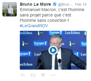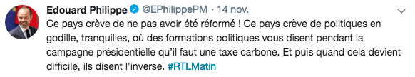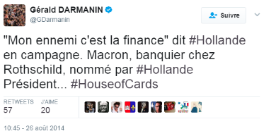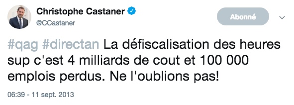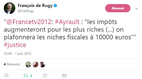 Cahuzac : Ministre chargé de la lutte contre la Fraude fiscale, lui même fraudeur. En liberté ! Sinon, twitter a de la mémoire, notre cher Ministre de l'Intérieur Castaner un peu moins : ![]() Et Richard Ferrand, notre cher Président de l'Assemblée Nationale non plus : Ou peut être notre Ministre de l'Economie : ![]() A moins que cela soit celui des Comptes Publics : ![]() Ou d'Olivier Dussopt, Secrétaire d'Etat auprès de Darmanin : Ou Olivier Veran, Rapporteur général de la commission des affaires sociales: Ou Hugues Renson, Député Membre de la commission des affaires étrangères : Ou Sylvain Maillard, Député Membre de la commission des affaires sociales : Ou notre Ministre de l'Ecologie : ![]() Visionnaire tout de même : Ou de notre Secrétaire d'Etat chargée de l'Egalité Homme Femme : Ou notre premier Ministre : ![]() Bref, je m'arrête là, c'est un puit sans fond : Par contre, il suffit de mettre une musique derrière l'intervention de Macron pour comprendre qu'il se moque du monde. https://www.facebook.com/100006354045812/videos/2269419119946534/ 3 Milliards d'économies sur les chômeurs, 5 milliards de remise d'ISF pour les plus riches. Pendant que Macron faisait son annonce : ![]() Coût de la mesure : entre 2 & 6 Milliards d'euros selon Bercy. Et ils viennent il y a quelques jours de voter pour la baisse de 40 Milliards de financements via CICE.