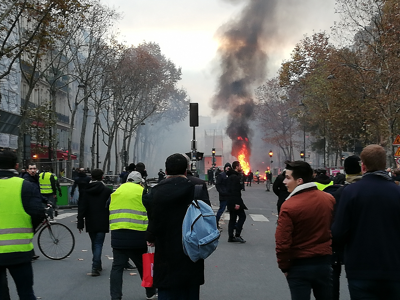 Hypothèse: sachant que la semaine dernière, malgré la non-déclaration de manifestation et donc l'interdiction de manifester sur les Champs-Elysées, les gilets jaunes et les casseurs sont quand même venus avant de se disperser pour aller brûler et casser sous les applaudissements des gilets jaunes (vu de mes propres yeux), la préfécture a préféré pour cette fois de permettre la manifestation sur les Champs dans l'espoir de pouvoir l'encadrer et de restreindre les dégâts. L'arc étant effectivement un symbole, c'est là que la manif était censé démarrer. C'est là aussi que beaucoup de journalistes se sont assemblés pour la suivre. Mais étant donné qu'on a des images des autres endroits c'est peut-être possible que des journalistes étaient aussi sur place, non? Hélas, comme la fois dernière les gilets jaunes accompagnés des casseurs n'ont pas respecté leurs propres demandes et se sont réunis ailleurs pour aller 'protester'. Après tout, comme on me l'a dit la semaine dernière quand j'ai protesté que flanquer les vendeurs ou ouvriers du BTP au chômage en détruisant leur lieu de travail c'était une drôle de façon de protester contre la vie trop dure, "les magasins et les sociétés ont des assurances donc c'est pas grave". Aussi vu la semaine dernière: Tentative d'incendie de batiments BTP, huée de l'intervention des CRS pour repousser la foule étant donné que les flammes montaient bien haut, caillassage des CRS, réponse au lacrymo, tentative de caillassage des pompiers avant fuite de tout le monde quand les CRS ont avancé. Alors soit les gilets jaunes s'organisent pour maitriser les casseurs dans leurs rangs, soit ils assument la responsabilité. ![]()