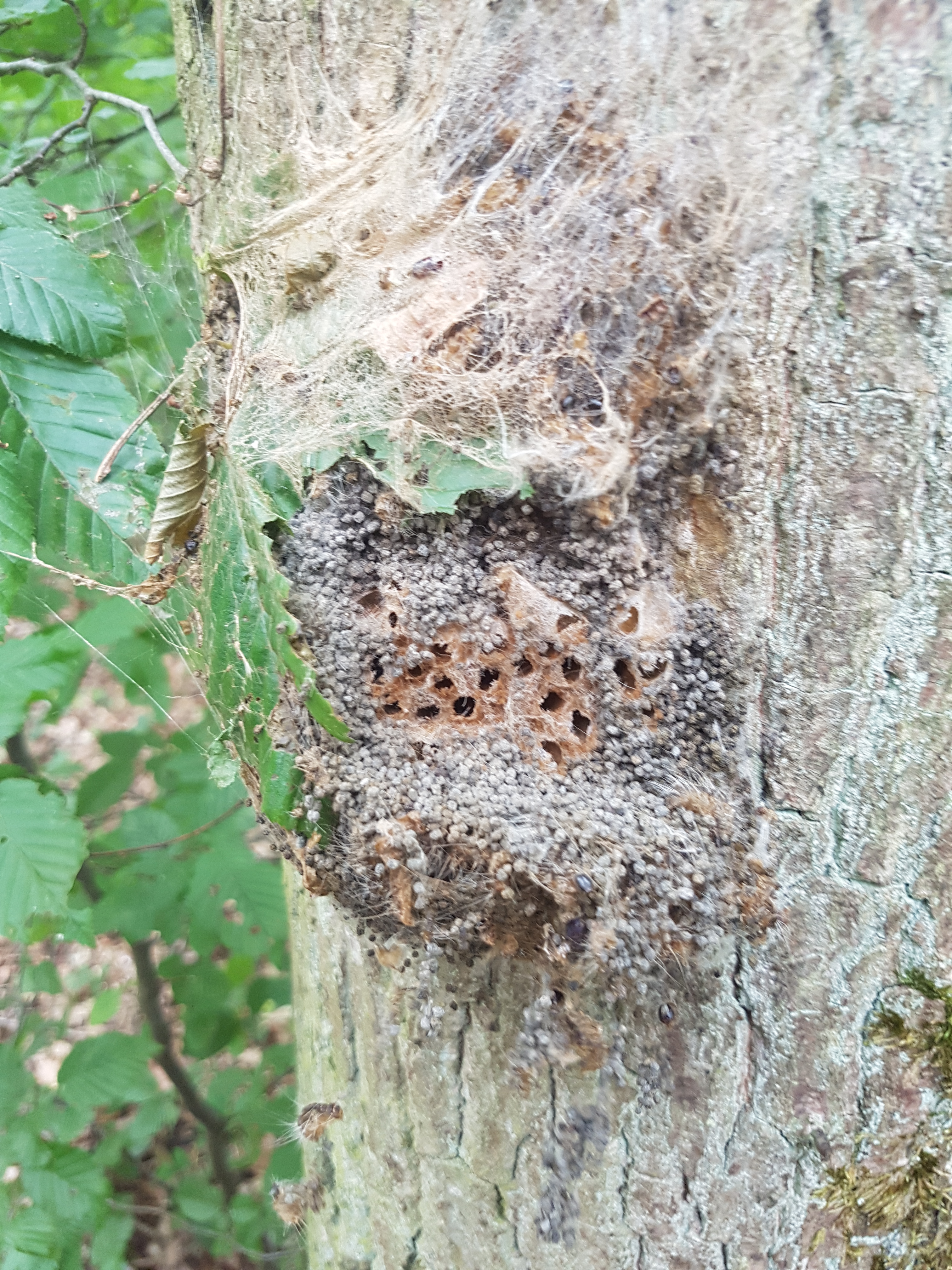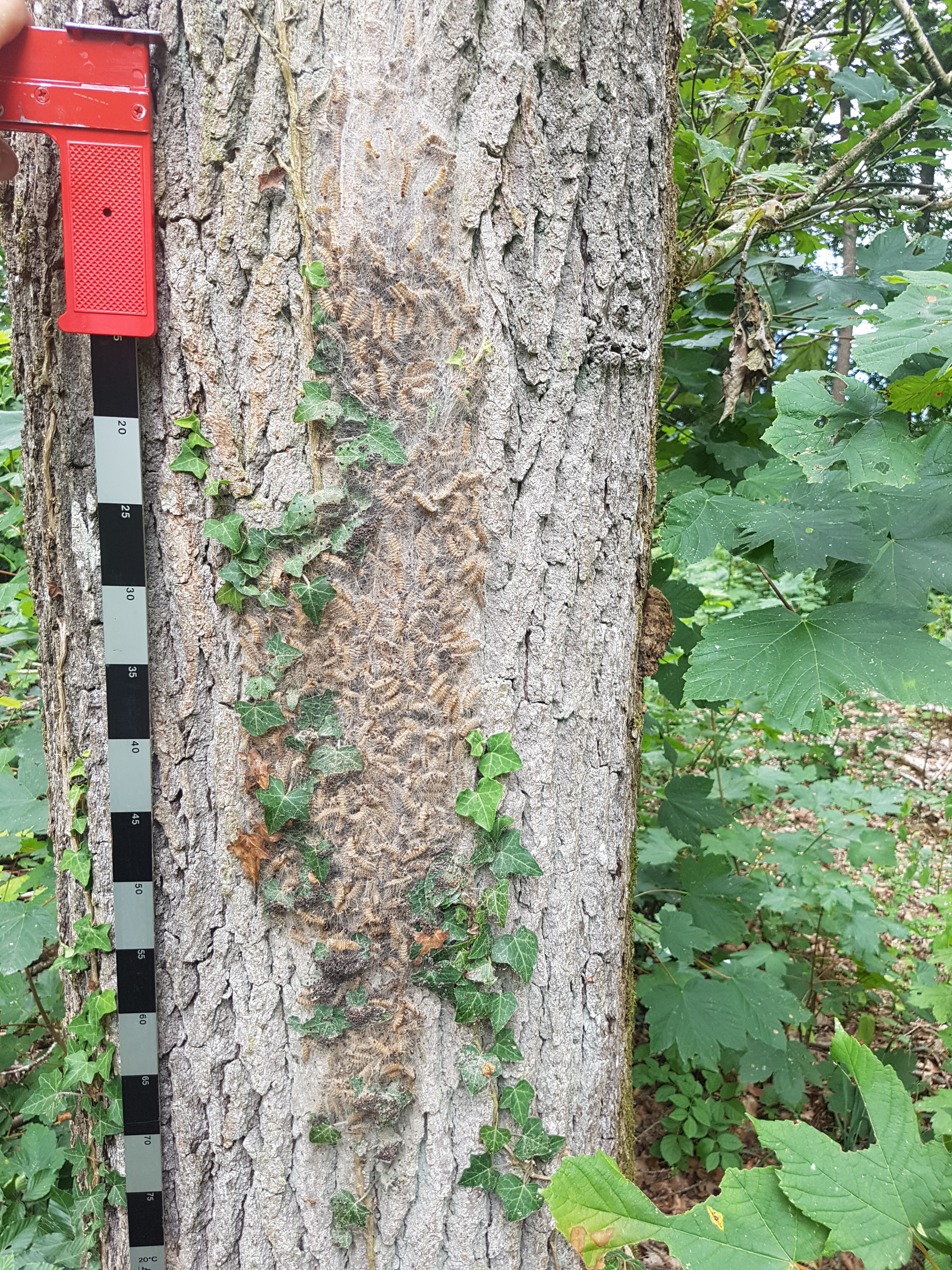 J'ai eu l'occasion de me frotter à ces saloperies quand j'étais bûcheron. Maintenant je les croise en martelage. Petites photos de l'été dernier : On voit bien ici le chêne victime de l'attaque, et son houppier des plus clairs. ![]() Elle fond aussi des nids à même le tronc, des petits... ![]() Et des plus importants... ![]()