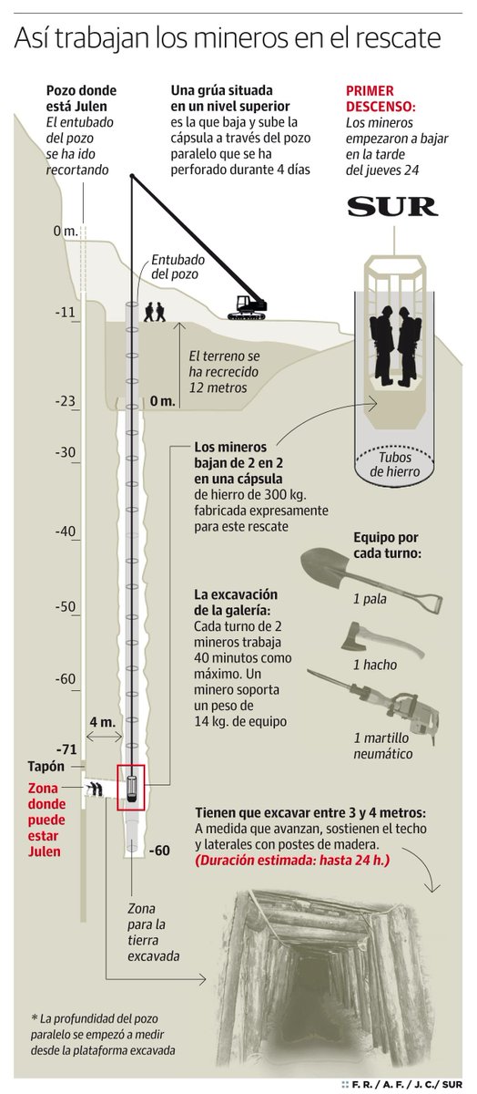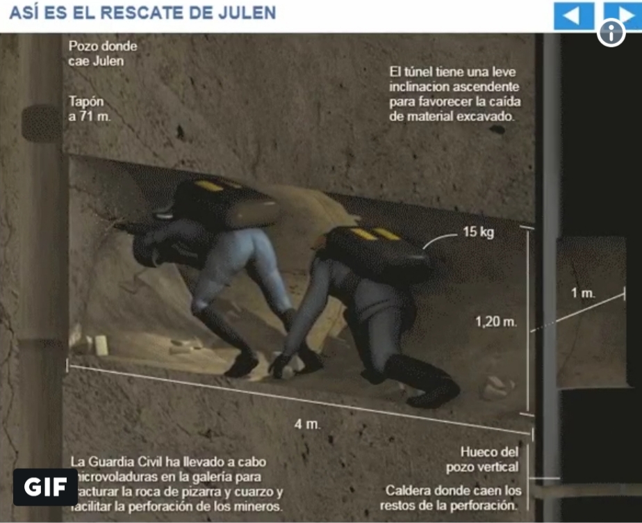 Je ne sais pas pour les autres médias. Apparemment non, car il reste aux mineurs 55 cm à parcourir avant de pouvoir atteindre le fameux puits de 100 mètres de profondeur. Un expert en spéléologie a affirmé que l'enfant avait une chance de survie mais très infime. Cela relèverait du miracle. D'autant plus que plusieurs facteurs sont en défaveur de la survie de l'enfant. Le premier étant la chute libre de plus de 70 mètres dans le vide. Le deuxième facteur étant que, si le petit garçon a survécu, aura-t-il assez d'air pour tenir 12 jours dans cet endroit confiné ou l'oxygène ne se renouvelle pas ? Puis, imaginons qu'il ait survécu à la chute, même si il y a de l'eau, et assez d'air, encore faut-il que les conditions sanitaires soient satisfaisantes pour survivre (Il se fait pipi et caca dessus et doit boire de l'eau qui est donc impropre à la consommation). Bref autant dire que c'est très compliqué, voir impossible. Nous ne pouvons que saluer le travail exemplaire et courageux des mineurs espagnols, qui apparemment sont parmi les meilleurs du pays, pour parvenir à retrouver le petit garçon. À l'heure où j'écris l'article, les mineurs ont réalisé à 55 cm du but, la 4ème detonation d'explosifs (faible quantite de dynamite) pour accéder au fameux puits. Ils vont sûrement tomber sur des eboulis qu'ils devront dégager afin de découvrir ou non Júlen en vie. Par ailleurs, la nature du terrain n'a pas été en leur faveur. Ils sont tombés sur des roches très dures qui ont rapidement émoussées leur matériel. Ce dévouement quasi héroïque et cet investissement acharné effacent le douloureux souvenir de la petite Omayra Sanchez, dans les années 80, qui succomba après 3 jours et 3 nuits passée à lutter pour sa survie, de fatigue et de problèmes de santé grave, bloquée dans une mare d'eau en Colombie... contrairement à ça, les espagnols se montrent très solidaires et utilisent le maximum de moyens pour aider cet enfant, même si les délais sont quasi hors espoir de vie... Tu peux regarder dans un premier temps sur Youtube une video diffusée par des médias espagnols qui montre le puit dans lequel le petit garcon est tombé. C'est assez dur. ![]() ![]() ![]() Enfin, sur cette image instructive, tu peux voir les moyens mis en place pour réaliser le trou vertical de 70 mètres de profondeur parallèle au puit dans lequel est tombé le petit garçon. ![]() ![]() ![]() ![]()
