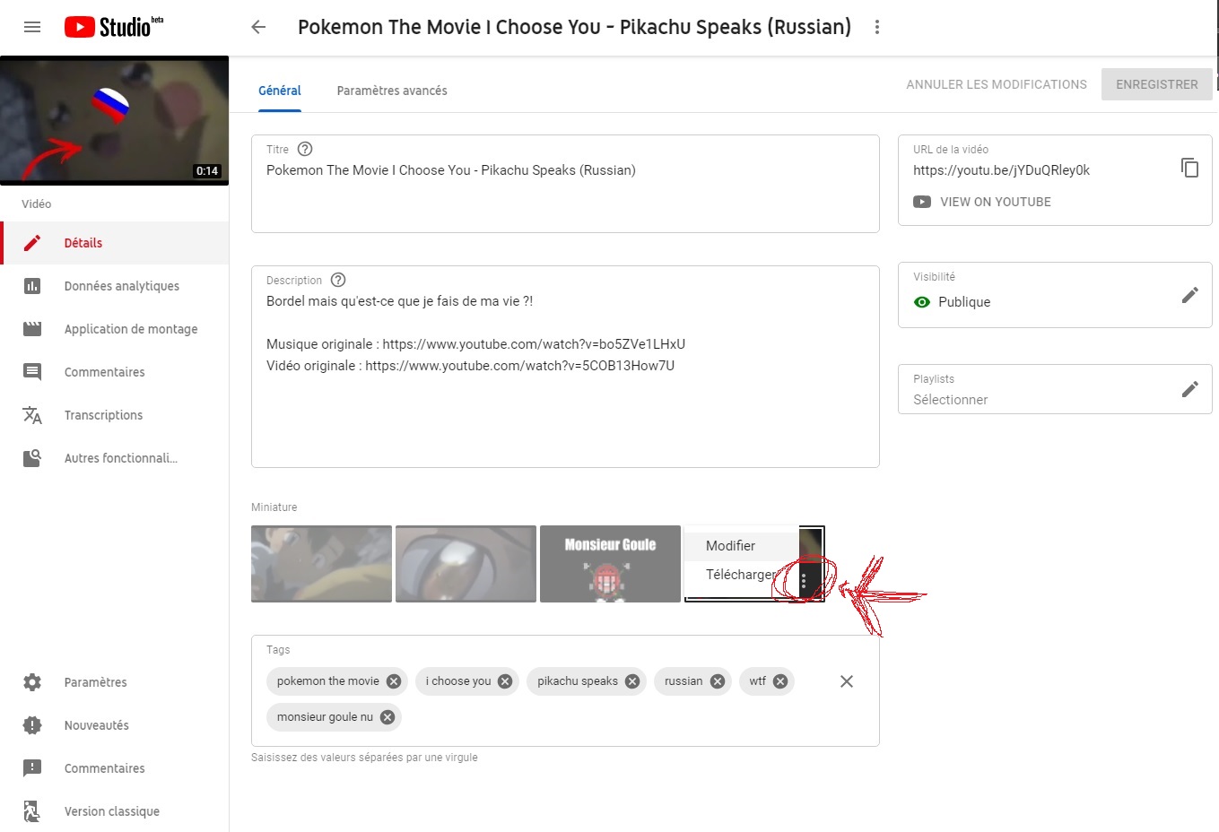 Tu vas dans la "version beta de youtube studio", puis sur l'onglet "vidéo" à gauche, tu clic sur ta vidéo et ensuite tu peux choisir une miniature de ton choix ou faite main ("modifier"): ![]()
