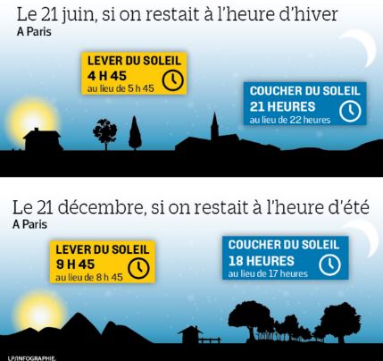 | FantômeInvité | J'ai fait un graphique pour faciliter le truc, je trouve un peu dommage que ça ne soit pas fourni de base avec le sondage mais bon : (clic droit -> ouvrir dans un nouvel onglet pour l'avoir en plus grand) Pour moi c'est heure d'hiver, c'est bien plus pratique pour ceux qui bossent en extérieur en hiver, et ça n'a aucune influence en été.