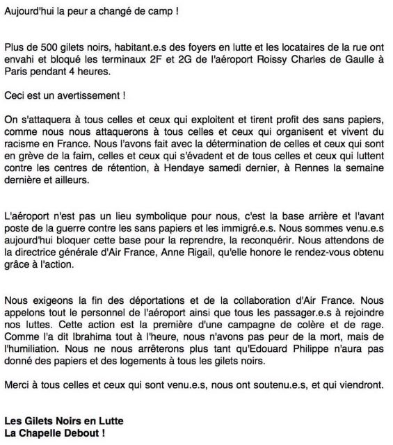 Moment de tension. Il n'y a pas eu de blessés Antifa protesters clash with riot police on the streets of Bologna Citation : Dans la ville de Bologne, en Italie, des militants du mouvement antifascistes ont battu le pavé le 20 mai pour manifester contre la visite du chef du parti d’extrême droite Forza Nuova, Roberto Fiore. Les manifestations ont dégénéré en affrontements violents avec la police locale. Via dailystar.co.uk - - - - - - Aéroport Charles de Gaulle : Environ 500 manifestants immigrés illégaux (nommés "black vests") ont manifesté en bloquant l'aéroport (au niveau du terminal 2), pour dénoncer les expulsions et demander une régularisation. La manifestation était organisé par le groupe de soutien aux migrants "La Chapelle Debout" et par le groupe "Les Gilets Noirs en Lutte". Une personne a crié dans son haut parleur "La France n'appartient pas aux francais ! Toute l'Afrique a le droit d'être ici". Le groupe de manifestants a demandé à rencontrer le 1er ministre (pour demander l'asile) et le PDG d'Air France (pour demander que la compagnie arrête tout financement et soutien logistique ou politique qui participent à la déportation). La manif a duré 4 heures et c'est finit dans le calme, sans dérapage. Le message "La France n'appartient pas aux francais" me parrait parfaitement mal choisi. Après sur la justification de la manif, j'y connais strictement rien du bien fondé ou pas. Citation : Deux collectifs de sans-papiers ont organisé hier un sit-in dans le terminal 2F de l’aéroport Paris-Charles de Gaulle pour dénoncer la politique de la compagnie aérienne Air France en matière d’expulsions d’immigrants illégaux. Ce lundi matin, un mouvement social des taxis risque de compliquer l’accès routier à CDG mais aussi à Orly. Les sans papiers #GiletsNoirs arrivent à Roissy pour dénoncer les expulsions Roissy - 19 mai 2019 Sotiri Dimpinoudis - #Update: Just in - All of these undocumented immigrants are from African decent, and are demanding that prime minister Édouard Philippe, will give all of them permanent legal status and papers to stay in #France. And saying we will not leave Charles de Gaulle Airport in #Paris. Et le communiqué des 2 groupes pour le fond et revendications : ![]() Via air-journal.fr (je ne connais pas ce journal) & nypost.com C'était la journée manif autre que Gilets Jaunes. Dis donc ca change