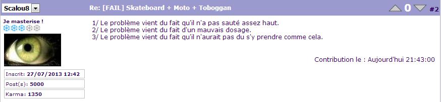 2/ Le problème vient du fait d'un mauvais dosage. 3/ Le problème vient du fait qu'il n'aurait pas du s'y prendre comme cela. Edit: Et puis ohhh mon 5 000em com' à 3 jours de mes 50 et avec un karma qui se termine par 50 ça le fait! ![]()