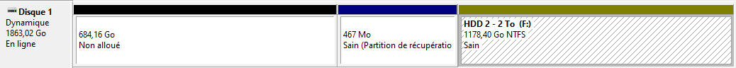 1. Pour ta remarque sur les Ko l'explication est juste, car "Kilo" en mathématique signifie toujours 1000 sauf en informatique ou il signifiait 1024 jusqu'au changement de 1998 ou 1Kilobit = 1000 et un Kibibit = 1024. D'ou le fait que 2 Terabit = 1.81Tébibit. 2. Donc si ton disque est bien en GPT c'est qu'il est totalement utilisable, et c'est donc bel et bien l'explication de JCM77 qui est la bonne. 3. Tu as plusieurs problèmes selon le screenshot. - La partition hachurée est celle qu'il faut étendre ou fusionner et devrait se situer à gauche. - Si la partition à étendre contient des données, il faut étendre vers la droite si on veut pas de perte (la c'est pas le cas). - La partition de récupération n'est pas formatable/supprimable depuis le gestionnaire (faut faire un diskpart). - On ne peut pas fusionner deux partitions non contiguës ou si l'une d'elle est une partition de récupération. - /!\ Et je crois que le gestionnaire de windows ne prend pas en charge "étendre" vers la gauche, mais plus très sur ... Résultat: Tu ne peux pas fusionner ta partition de droite avec celle de récupération à sa gauche, ni celle non allouée car pas contiguë. Ta partition allouée est bloquée ta partition de récupération, tu peux donc rien faire. Voilà pourquoi tu ne pouvais rien en tirer de ton HDD ![]()