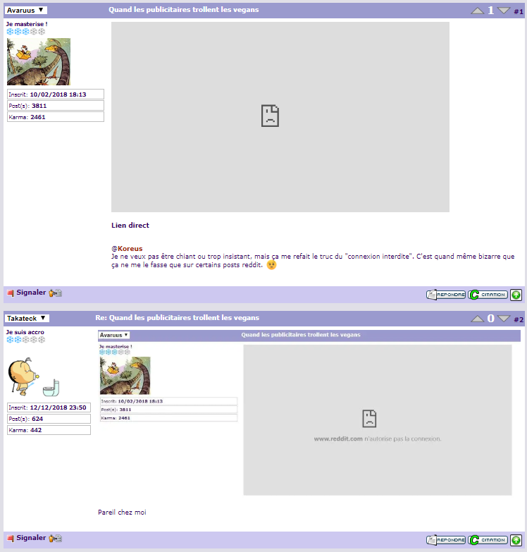 Lien direct @Koreus Je ne veux pas être chiant ou trop insistant, mais ça me refait le truc du "connexion interdite". C'est quand même bizarre que ça ne me le fasse que sur certains posts reddit. ![]()
