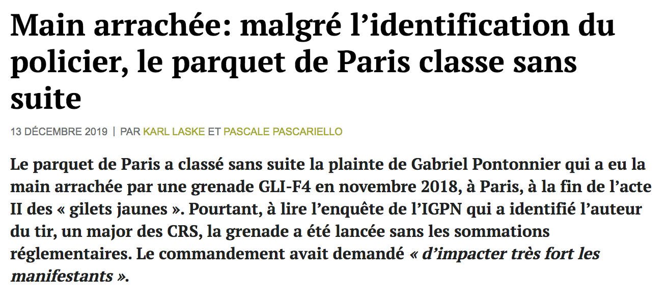 Il y avait eu un cas similaire à Toulouse, le mec se fait démonter au sol à coup de tonfa par minimum 5 policiers (de mémoire), tout le ratelier au sol. Après ils se barrent tranquillou.