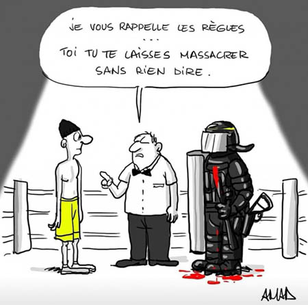 Citation : Et ceux qui espère encore faire leur travail respectueusement sans dénoncer les dérives de leur collègues sont à mettre dans le même sac! Il y a un silence des "bons" flics qui n'arrange rien... Et un blanc-seing donnée par leur hiérarchie qui me donne la nausée. J'ai fait quelques rond point, j'ai vu et même discuter avec ces fameux "bons flics" qui au début ont même déposé leur casque. Mais aujourd'hui ça a changé, l'heure n'est plus au maintien de l'ordre, ils sèment la terreur pour dissuader les gens de manifester. Il semblerait que la république soit en marche coûte que coûte et qu'elle n'ai pas l'intention de s'arrêter pour écouter les revendications du peuple, quitte à lui faire fermer sa gueule à coup de botte dans les gencives. Dans quel pays voit on ce genre de scène quotidiennement en se demandant si les policiers vont être oui ou non inquiétés? Pas dans le pays où j'ai grandit en tout cas ![]() edit @Chouba ... ![]()