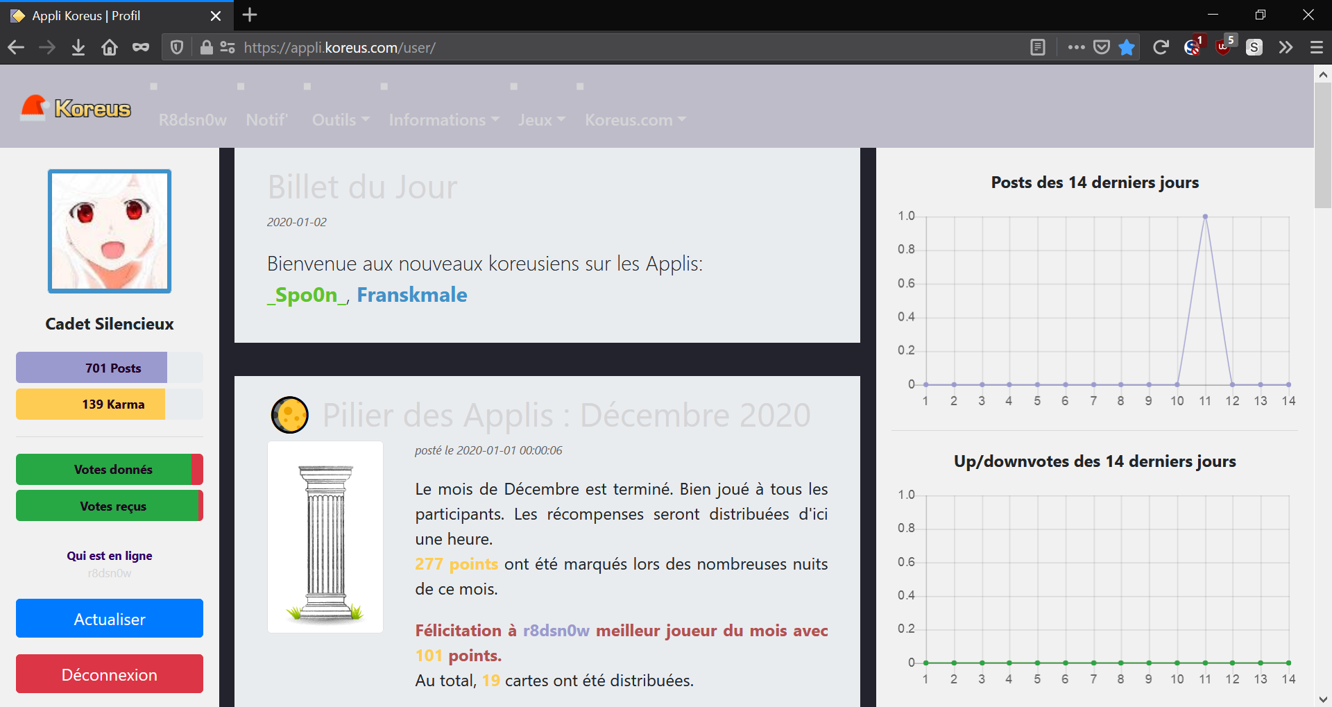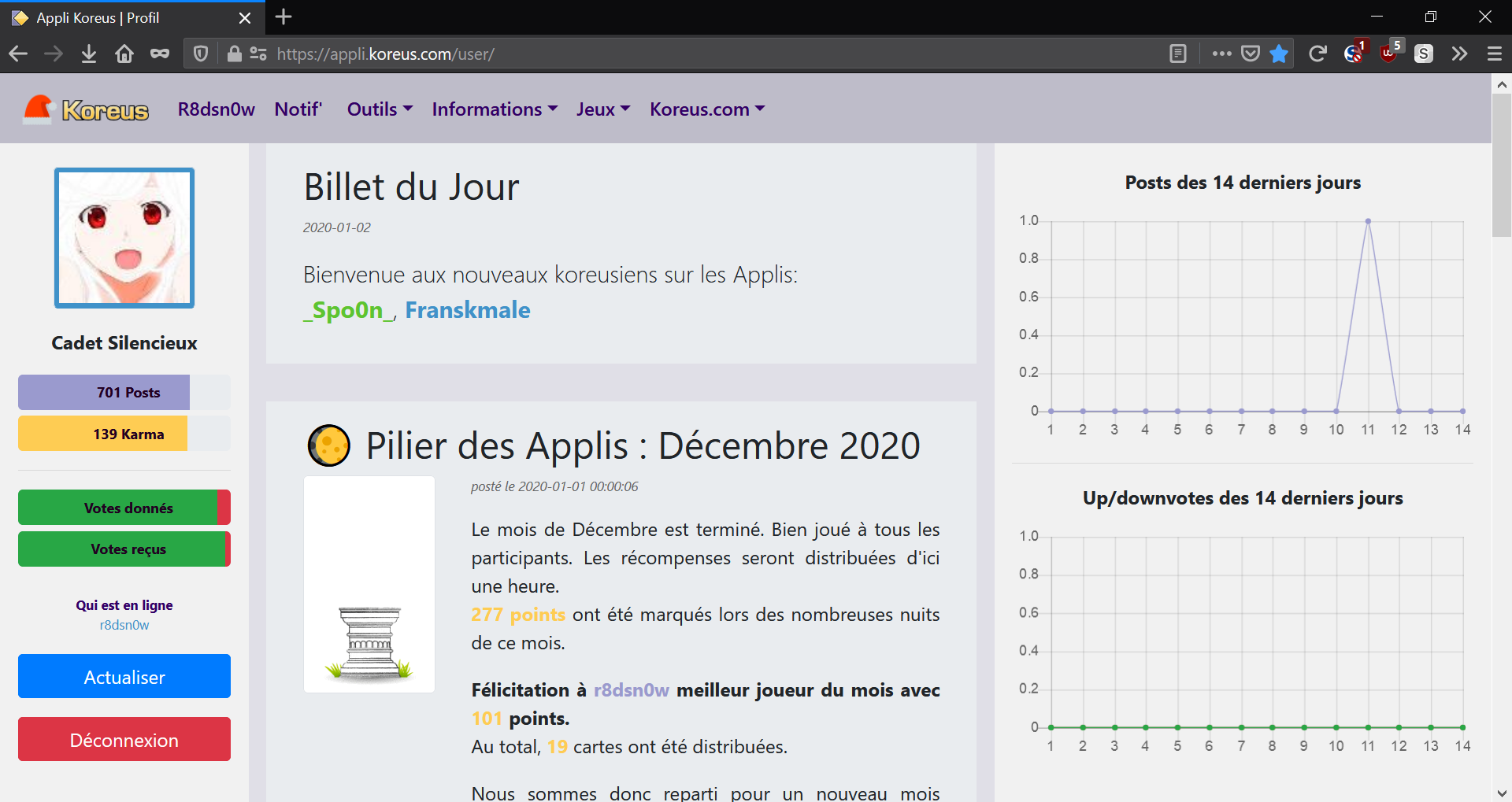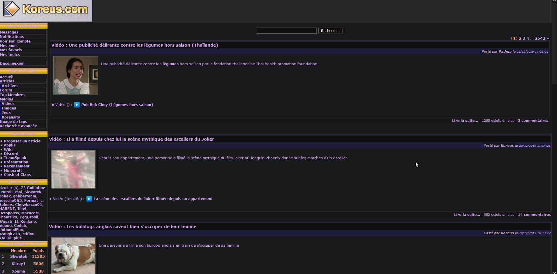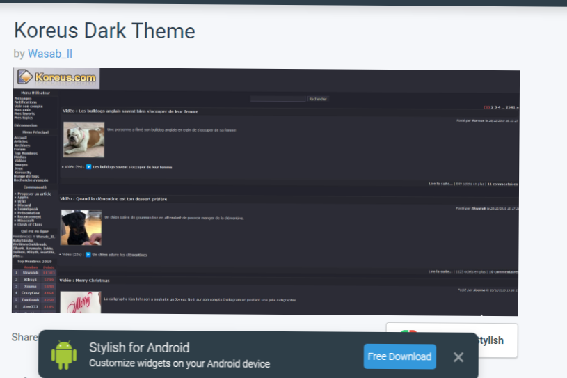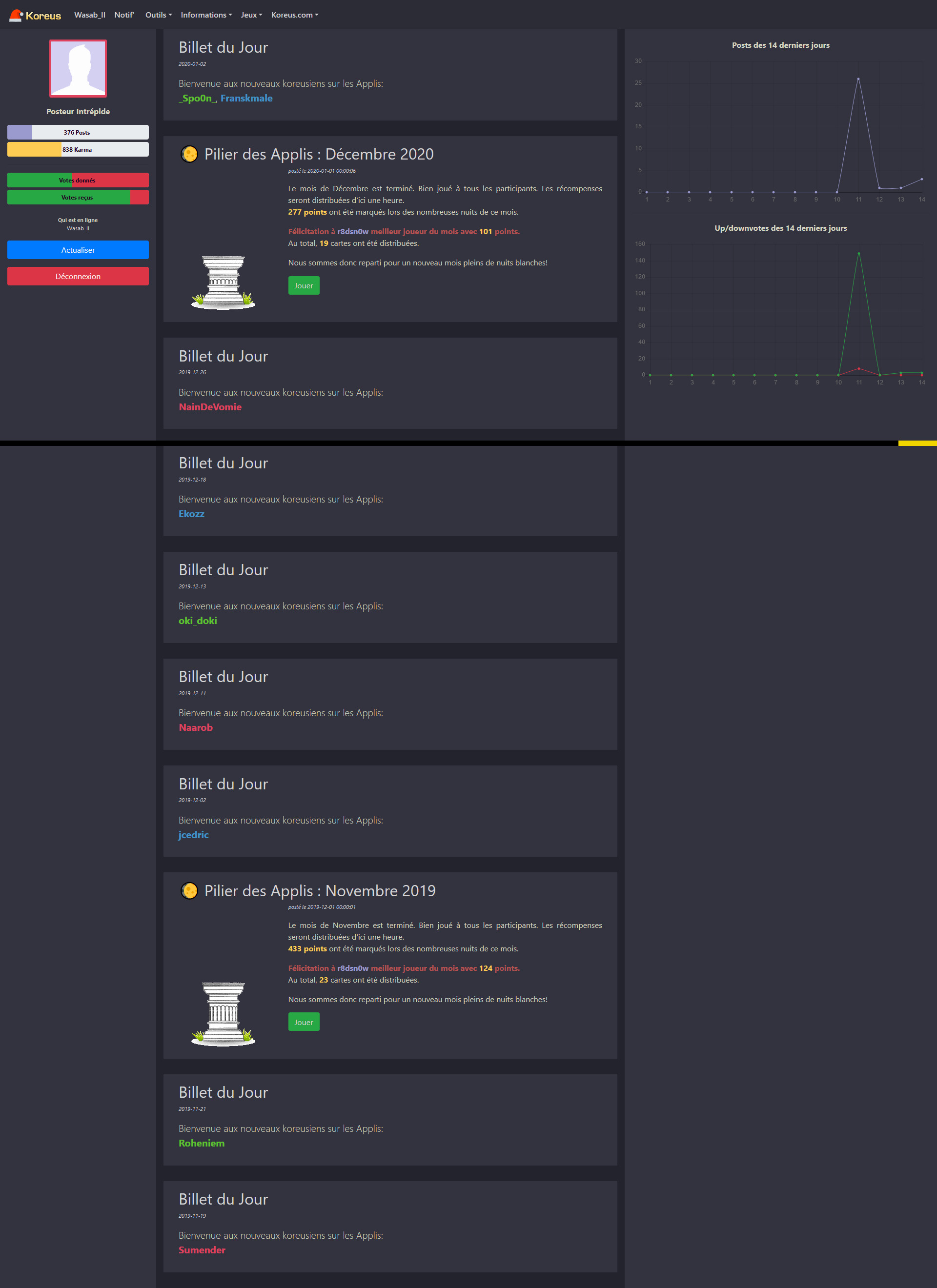 Comme je n'avais rien à faire, je me suis lancer dans la réalisation d'un thème sombre pour le site, vue que je suis moi même un être vivant la nuit, je trouvais utile d'en faire un et de le partager. Je l'ai créé à l'aide de Stylish ^^ Quelques aperçus : ![]() Suffit d'installer l'extension Stylish ou Stylus (Stylus a tendance à mieux fonctionner) et d'aller installer le style présent ici : https://userstyles.org/styles/178674/koreus-dark-theme EDIT : Vous pouvez maintenant en modifiant l'entête, avoir votre propre couleur de thème ! Donc ce n'est plus spécifiquement un thème Sombre mais plutôt un thème modulaire à présent ![]() Avec ce réglage par exemple : Vous avez ce rendu: ![]() Vous pouvez modifier à votre guise la teinte/saturation et luminosité et partager votre teinte favorite:p N'hésitez pas à partager ! Car je n'ai pas tout découvert Je suis frilant de tous commentaires sur le thème ! Voili voilou:p