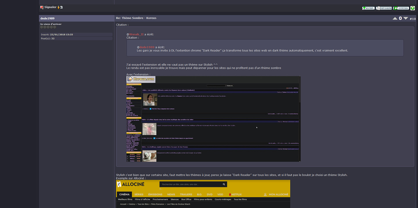 Stylish c'est bien que sur certains site, faut mettre les thèmes à jour, perso je laisse "Dark Reader" sur tous les sites, et si il faut pas le boulot je choisi un thème Stylish. Exemple sur Allociné :
