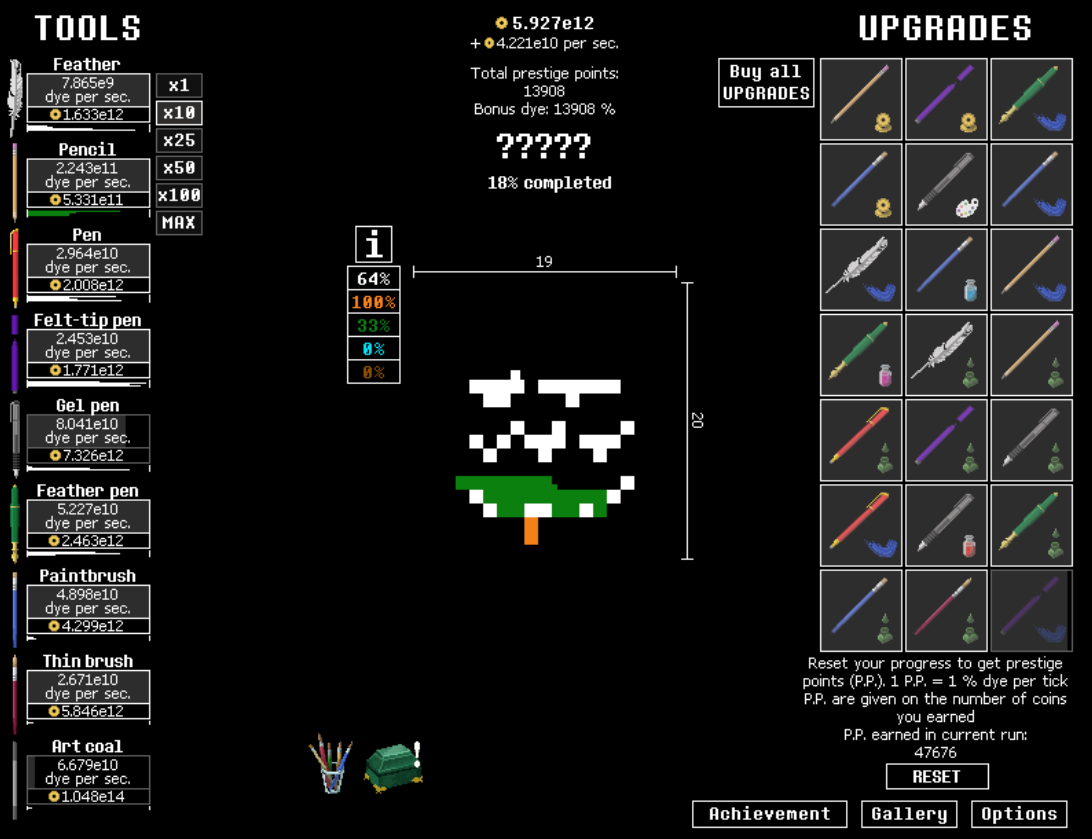 ![]() >>> Jouer à Aspiring artist 2 <<< Synopsis: Idle game: Le but est d'améliorer vos compétences pour dessiner plus rapidement et progresser plus loin. Réinitialisez votre jeu si vous sentez que votre progression est bloquée. Comment Jouer: • souris Genre: #améliorations#détente#pixel Bon jeu!