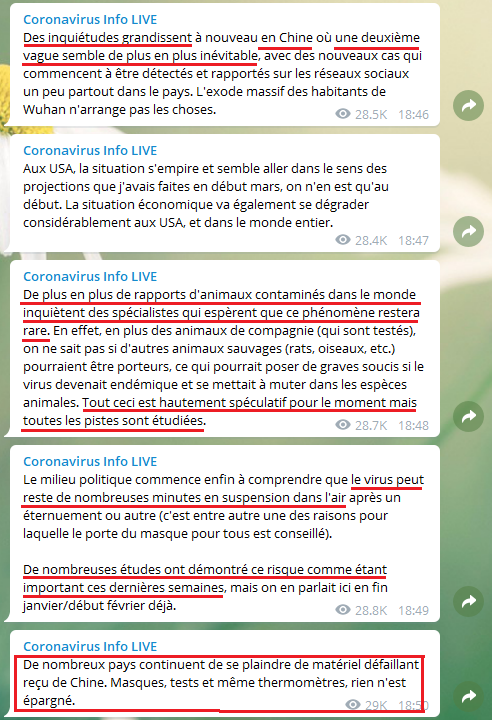 Pour ma part, ce qui me fâche le plus, c'est que cette méthode est utilisée depuis longtemps par nos politiques. C'est pourquoi je suis si critique à l'égard de notre gouvernement. Je suis entièrement d'accord avec baliboudou quand il dit qu'on ne peut pas leur en vouloir d'avoir eu des doutes et d'avoir été dans le flou au début. Par contre, on peut leur en vouloir : - de faire une communication de très mauvaise qualité, qui nous donne vraiment l'impression que nous sommes au mieux infantilisés, au pire pris pour des gros débiles - d'avoir négligé certaines infos essentielles dès le début de la crise car, même si elles étaient noyées dans un gloubiboulga compliqué à interpréter, les envisager comme possibles et les intégrer dans les discours et dans les décisions prises me paraissait de première nécessité (et c'est le rôle d'un chef de faire ça, s'il échoue dans cette tâche, on peut raisonnablement remettre en cause sa qualité de dirigeant) Quand on dirige quelque chose, on doit prendre des précautions. Et là, ce sont des gens qui dirigent 68M de personnes ! Bref, les prises de décisions sont une chose, mais quand on rajoute une communication dysfonctionnelle et parfois insultante pour les citoyens, faut pas s'étonner que ça en impatiente certains. Et comme je l'ai dit plus haut, cette com' dysfonctionnelle et parfois presque insultante n'est pas nouvelle. @Lyrael Citation : Il y a de plus en plus de personnes qui sombrent dans la dépression car le confinement est quelque chose d'extrêmement difficile à vivre. Le plus dur n'est pas le fait de ne pas sortir, mais le fait de voir sa relation à la vie réduite à néant. Beaucoup ont le sentiment de ne servir à rien, de ne plus avoir de valeur. Personnellement, je vis très bien le confinement (sauf quand les enfants des voisins du dessus décident de courir et sauter à 6h30 du mat'^^). Mais ce que tu dis me touche particulièrement, parce que c'est exactement ce que j'ai subi dans mon travail. Et c'est ce qui contribue aujourd'hui à attiser ma rancoeur à l'égard d'un gouvernement qui, non content de massacrer ses personnels de la fonction publique, les méprise en leur mentant constamment ou en les prenant pour des crétins. @Tchairo Je suis on ne peut plus d'accord avec Stéphane Ravier, et ça correspond, je trouve, à ce que dit baliboudou plus haut. Question : à votre avis, pourquoi le gouvernement insiste-t-il pour renouveler le confinement toutes les deux semaines ? Pourquoi ne dit-il pas d'emblée "on risque d'être confinés pendant au moins 1 mois et demi, nous vous avertirons si ça évolue vers une diminution" ? Pour moi, c'est ça la meilleure solution de communication. Je dirais même que c'est encore mieux de dire : "Afin de prendre nos précautions, nous prévoyons 2 mois de confinement. Mais si les chiffres liés à la pandémie évoluent positivement en France, nous serons enclins à réduire ce temps. Personnellement je trouverais ça plus sage, et ça traduirait à mon sens une meilleure gestion de crise car ils assumeraient chaque décision à prendre. Bon sinon, quelques nouvelles du gars de Telegram : ![]() Et sinon, quelqu'un aurait-il plus d'infos qui permettraient de vérifier cette affirmation ? ![]() On a bien sûr déjà vu quelques tensions émerger avec les différentes saisies abusives et/ou involontaires de masques, mais y aurait-il d'autres infos quelque part ?