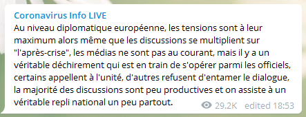 L'Italie qui a été à moitié abandonnée par l'Europe a été jusqu'à retirer des drapeaux européens pour mettre à la place des drapeaux chinois lorsque les chinois sont venus en renfort. Là-bas la montée d'eurosceptique risque d'être énorme, je ne serais même pas surpris qu'ils finissent par vouloir quitter l'Europe. La Suède a été très agressive envers la France à cause de la réquisition, mais de manière générale il y a des désaccord dans tous les sens et tout le monde s'offusque partout. Il y a clairement de grosses tensions, mais en même temps il y a de grosses tensions interne à chaque pays aussi à cause de la crise. Il faudra voir si ces tensions persistent après la crise sanitaire, surtout que ce sera le moment de se tourner vers l'économie et où l'Europe aura énormément besoin de faire ses preuves. --- Sinon la situation en Chine m'inquiète un peu honnêtement. J'ai l'impression qu'ils sont en train de se prendre un début de seconde vague mais que le gouvernement chercher à l'étouffer. De toutes façons ça seul le temps pourra nous le dire. D'autres pays ont eu une remontée des cas lors de relâchement, je serai surpris que cela n'arrive pas en Chine. Avoir 0 cas alors que le virus est partout dans le monde c'est quand même fort.