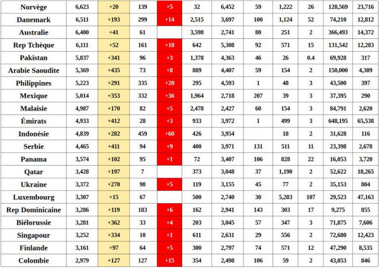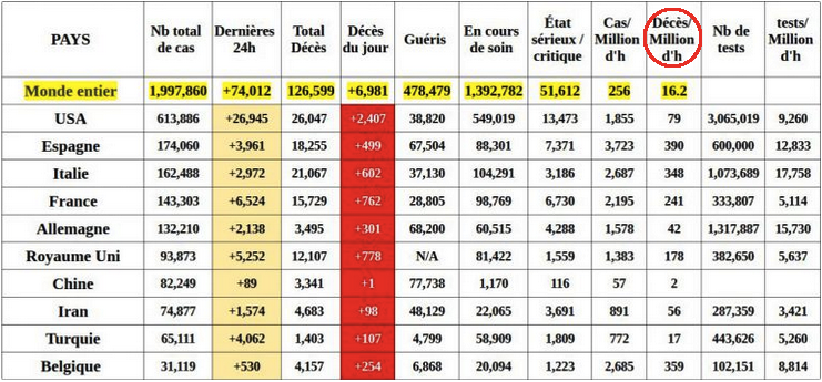 Coronavirus : Leur gestion est pire que le Covid-19 ! Un bon résumé d'une partie du problème ! ^^' * * * * * * * * * * * * * * * * * * * Bilan covid' mondial au 15 avril 0h00, ce tableau ne comporte que les 61 états ou territoires ayant enregistré plus de 1 500 cas. ![]() ![]() ![]() ![]()