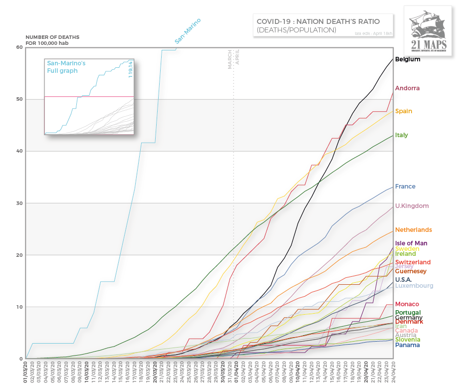 ![]() Courbe mise a jour du ratio mort/population Je trouve ça fou que la Belgique numéro 1 ( hors saint marin ) parle de tous ré ouvrir bientôt ( même si on est d accord ça semble les seules avec des chiffes les plus proche de la réalité) La Suède semble prendre son envole aussi malheureusement pour eux ,leur stratégie semble voué a l échec étant donné que la théorie de l'immunité Collective bat de l aile