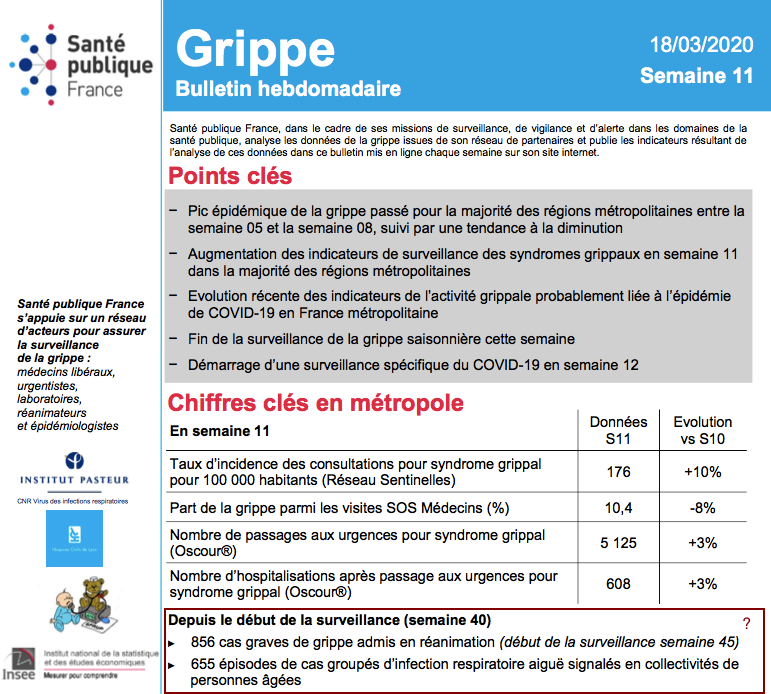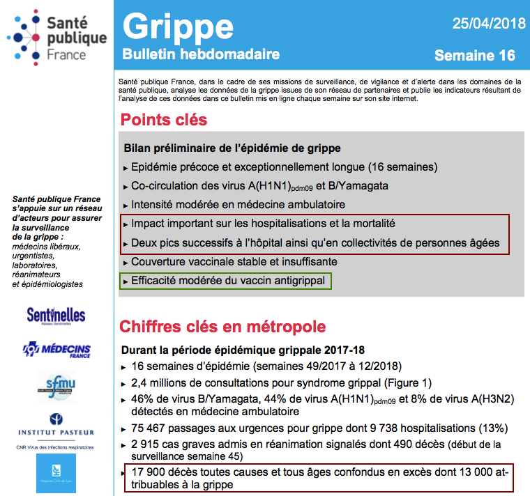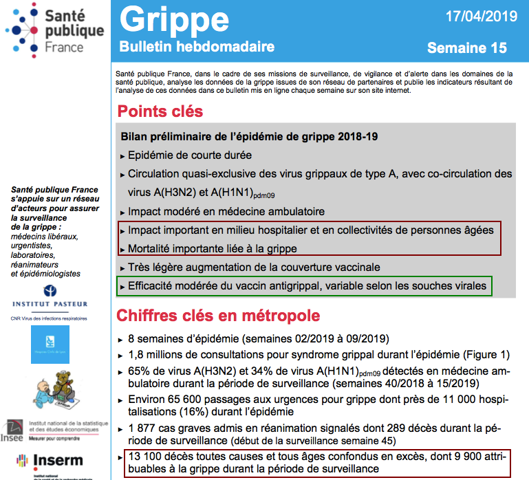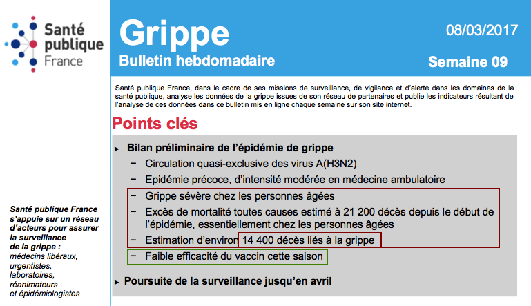 Bulletin épidémiologique grippe, semaine 9. Saison 2016-2017 ![]() Bulletin épidémiologique grippe, semaine 16. Bilan préliminaire. Saison 2017-2018 ![]() Bulletin épidémiologique grippe, semaine 15. Saison 2018-2019 ![]() Bulletin épidémiologique grippe, semaine 11. Saison 2019-2020 ![]() Bravo le corona ! Il a vaincu la grippe saisonnière en France ! (SARCASME) Ça me titillait, ça m'a pris "5 minutes" à vérifier... ![]() Edit: Et j'aurais dû au moins en prendre "6" pour constater par moi même la non pertinence de ce message car les statistiques 2015-2016 donnent des chiffres bien moindres sur le nombre de décès de la grippe (voir messages suivants). ![]()