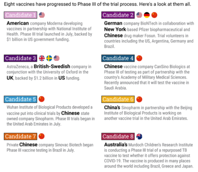 Les 8 vaccins actuellement candidats en phase 3 de test clinique (dernière phase avant validation ou non) :
