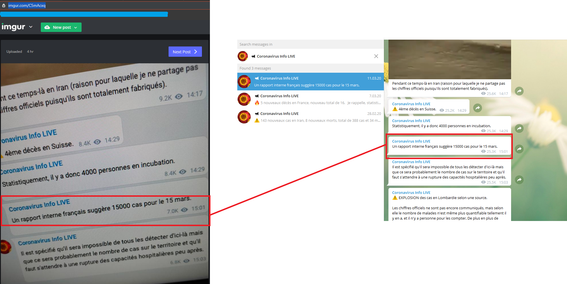 je suis le flux en live, et il a clairement annoncé les points que j'ai évoqué ( pas d’extrapolation ou quoi ) , telegram permet de supprimé les messages envoyés , d'ou ma capture sur les 15000 cas , le 15 mars officiellement on était à 5k cas tres loin donc des 15k