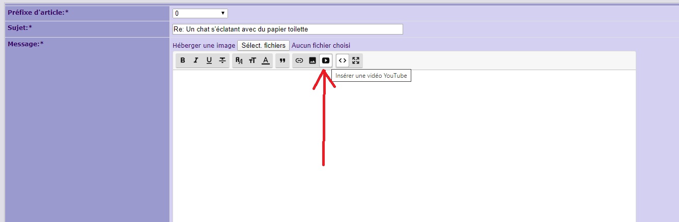 J'ai déjà regardé le tuto qui explique comment intégrer une vidéo sur le site. Mais après avoir cliquer sur "proposer un article", je n'ai pas accès au bouton "intégration", j'ai juste une "case" qui me permet d'envoyer le lien. Peut être y a t'il une manipulation à effectuer sur mon compte? C'est vraiment la première fois de ma vie que je rencontre ce type de problème sur un site ...