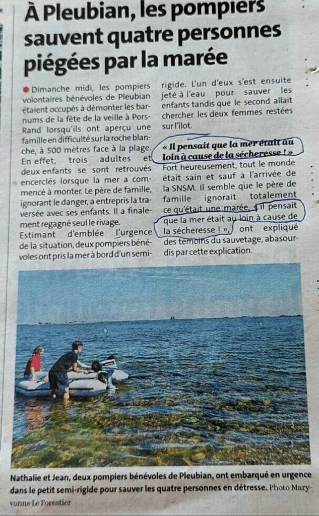![]() « Il semble que le père de famille ignorait totalement ce qu'était une marée. "Il pensait que la mer était loin à cause de la sécheresse !", ont expliqué des témoins du sauvetage, abasourdis par cette explication. » ![]()