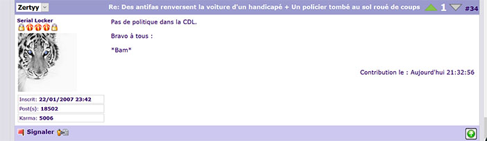 Quand il y a la police (et en particulier aux fêtes de la musique), personnellement je ne fais pas attention parce que j'imagine qu'ils sont souvent appelé pour des bastons, etc.. Si dès que j'en aperçois quelquepart je rentre chez moi, je ne sortirai pas souvent ![]() 19 000 tirs de LBD c'est quand même énorme, tu ne trouves pas? Avec un nombre aussi élevé, forcément il y a des fails, mais en même temps, est ce que tous ces tirs étaient vraiment réfléchis? Je pense que pas mal d'accidents ont eu lieu non pas parce que la balle n'a probablement pas touché sa cible et a fait du dégat derrière. J'ai le souvenir d'avoir vu aux infos la vidéo d'un des derniers qui a perdu son oeil et qui était filmé au même moment. Il l'a perdu pendant qu'il discutait loin de l'affrontement, mais le policier s'est trompé de munition et au lieu de tirer une cartouche de proximité, il a tiré un truc qui peut faire une centaine de metre. D'où l'intérêt d'un personnel formé et qualifié. Mais c'est une discussion où toi comme moi avons notre avis et peu de chance qu'on en change comme ça au travers d'un echange sur un forum ![]()
