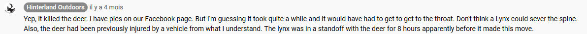Apparemment, le cerf était blessé. Il aurait été percuté par une voiture avant d'être attaqué par le lynx 8 heures plus tard.