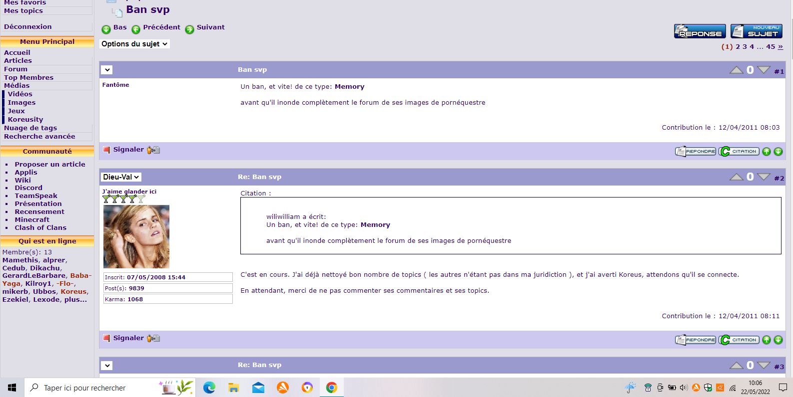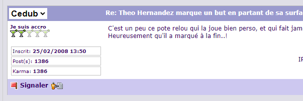 ![]() Cet enfoiré m'a piqué mon pseudo et en plus il l'orthographe horriblement! Je le vie très mal! ![]() Le pire, j'ai déjà reçu des MPs de fans du chanteur qui me demandent si j'aime bien l'artiste. ![]()