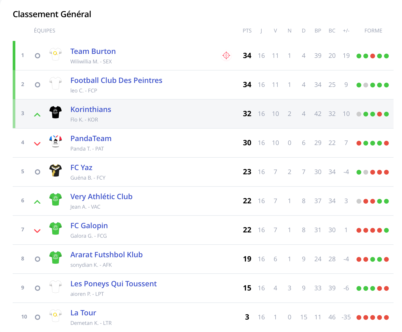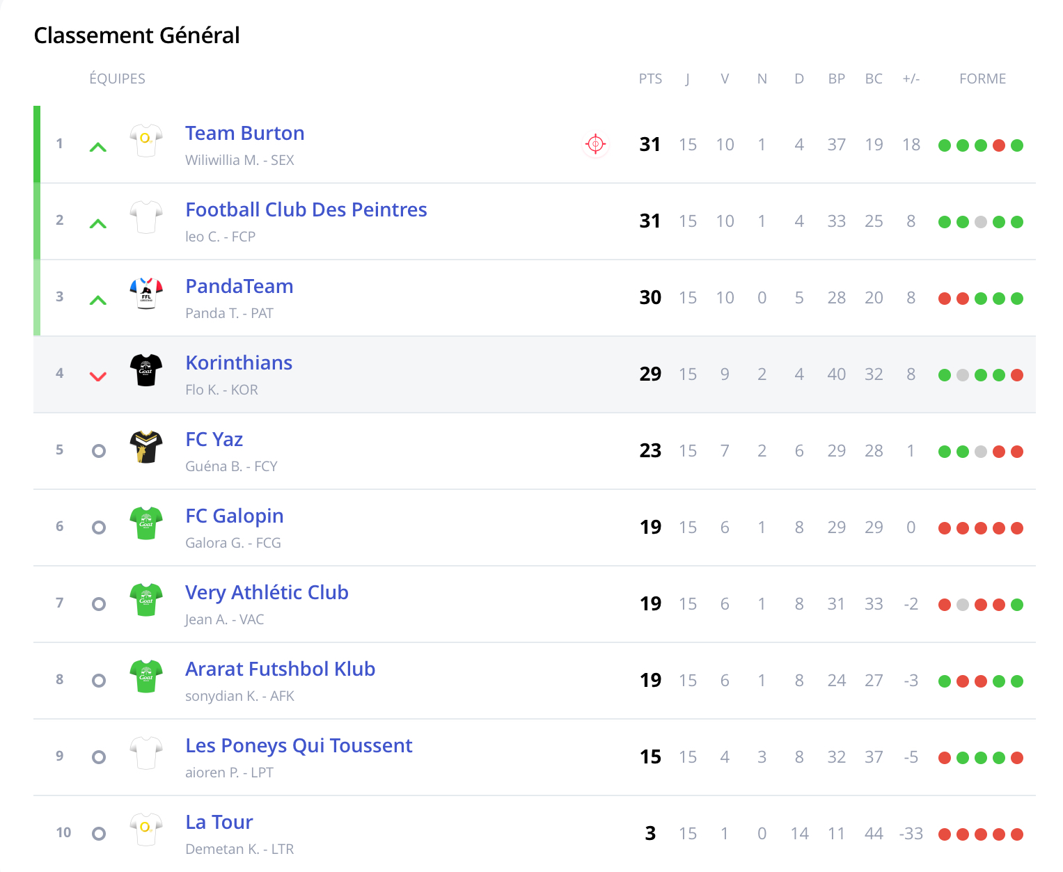 ![]() @LeCromwell Ouais la première chose à savoir avant de décider du nombre de ligues, c’est combien on sera à participer à cette deuxième saison. Il faut au moins être 6 par ligue je pense, en dessous c’est un peu trop short. Donc il faudrait au moins 12 participants, et je suis pas sûr qu’on les atteigne. Moi en tout cas j’en suis ! Bon sinon, les résultats à deux journées du dénouement : ![]() ![]()