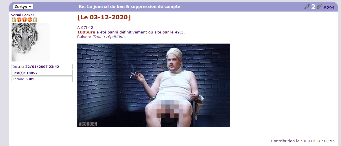 Je ne peux pas trop rebondir comme j'aurais voulu sur les réponses de tout le monde, beaucoup de choses on été dites. J'aimerais quand même répondre à @Koreus : J'ai trouvé le motif de la modération disproportionnée La méthode qui en est venu à la suppression de l'image est abusée, je ne vais pas m'étaler là-dessus d'autres l'on parfaitement expliqué. Si insulte il y a, qu'il y est modération est parfaitement normale mais je trouve ça malsain que des membres puisse faire la police de l'humour. J'aurais encore des choses à dire mais je suis breaucoup trop dans le gaz pour mettre en ordre mes idées