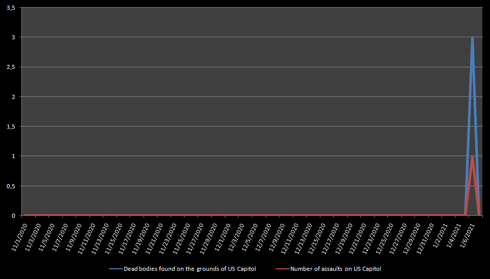 Les 3 individus en question sont décédés sur le terrain du Capitole, et aucun d'entre eux n'est originaire de Washington ni des environs. Je me demande s'il n'y aurait pas un lien avec les manifestations. Ce qui coïnciderait avec le fait que la police les a cités dans le bilan de l'événement dès sa première allocution. Mais... Non ! Je vais bien trop vite en besogne ! Ne tirons pas de conclusions hâtives ! Ouf, il était moins une ! Je sens que j'étais à deux doigts de basculer dans le sensationnalisme en insinuant que 4 personnes sont mortes à l'occasion de cet événement. Alors qu'on ne peut toujours décemment pas écarter la piste d'un ongle incarné qui se serait infecté sans lien direct, tant qu'on n'en sait pas plus sur la cause de leur mort.Tout ce qu'on peut dire, c'est que 3 personnes sont décédées autour du Capitole. Est-ce que ça a un lien ? Mystère. Pour s'en faire une idée en attendant d'en savoir plus, il faudrait déjà avoir des stats sur le nombre de cadavres découverts quotidiennement autour du Capitole en temps normal, histoire de voir si le nombre d'hier est inhabituel. Je ne sais pas si quelqu'un sait où est-ce qu'on pourrait trouver ce genre de chiffres ? Parce qu'admettons que les jardiniers en ramassent en moyenne 5 tous les jours, par exemple. Et bah forcément, là ça ne voudrait pas dire grand chose. Alors svp, un peu de rigueur intellectuelle et de déontologie. [Edit] Ah ! J'ai trouvé les stats que je cherchais, sur les deux derniers mois ! ![]() J'ai l'impression qu'il y a un truc à creuser, là... C'est comme s'il existait une sorte de relation intime entre les deux courbes. Mais si c'est le cas, dans quel sens ? Et si au contraire, j'étais simplement face à ce que les statisticiens appellent l'effet cigogne. Rah ! Je ne sais pas quoi penser de tout ça.Il faut se rendre à l'évidence : mon enquête piétine. Mais quelle investigation passionnante !