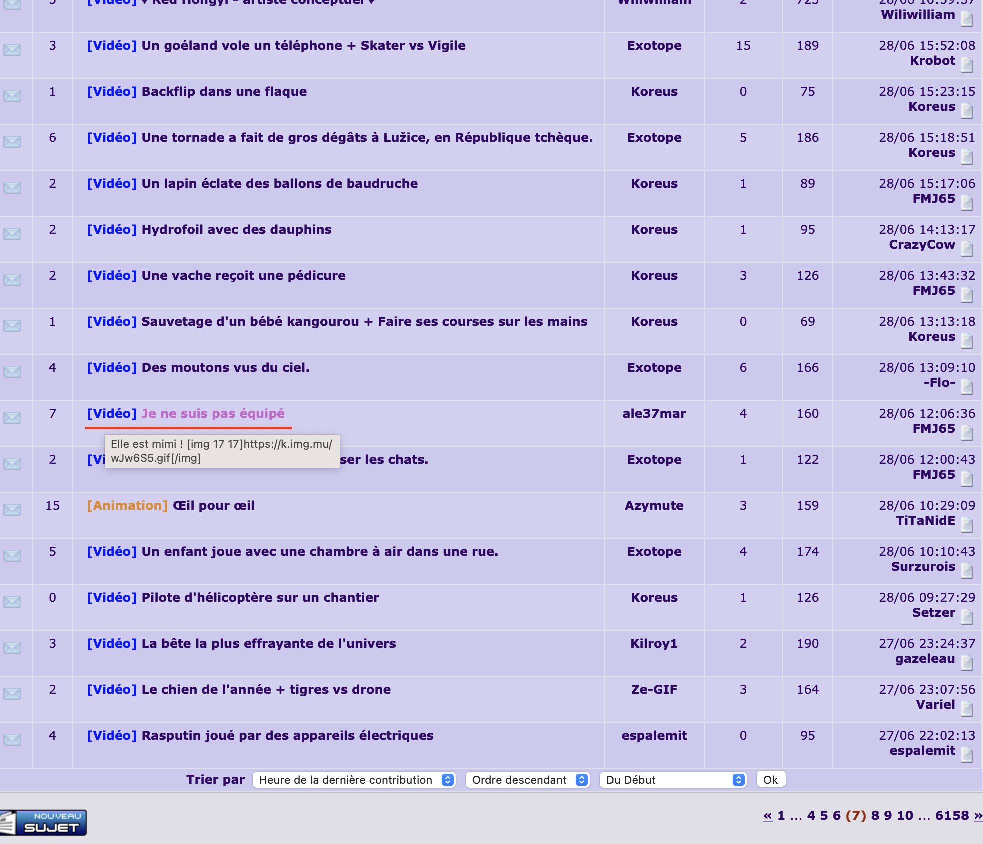Je viens de tester et moi aussi, il me manque une page dans la cdl: entre la page 6 et 7, je n'ai pas, à l'instant, les posts du 27/06 aprèm et du 28/06 matin. Dernier de la page 6: [Vidéo] Backflip dans une flaque Koreus 0 73 28/06 15:23:15 Koreus Premier page 7: [Vidéo] Vidéo du 8eme vol sur Mars du mini hélicoptère Ingenuity Ze-GIF 2 152 27/06 18:48:45 Variel Je propose de vérifier la pagination qui pourrait être plus grande que le nombre de lignes affichées. Si je génère la page 6 et demi (forum8-165.html) J'ai 14 entrées qui n'apparaissent pas page 7. forum8-150: ![]() forum8-165: ![]() forum8-180: ![]() Invocation @Koreus #BUG!