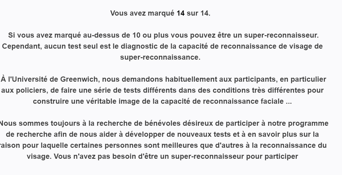 Ils ne disent pas que faire plus de 10 points est exceptionnel, ils disent juste que si tu fais plus de 10 points tu POURRAIS être un super-physionomiste. Ce qui est logique car si tu fais 2 ce n’est probablement pas le cas. ^^ Mais il y a tout un tas d’autres tests à faire.