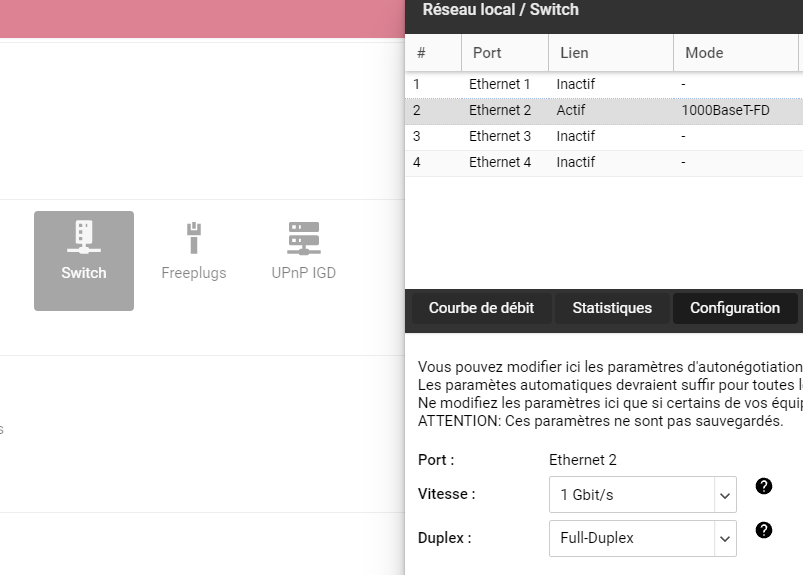 Alors @AymericCaron effectivement ma Freebox affiche une connexion à 100mbit/s, je viens de forcer le parametre "automatique" en 1Gbit/s et la connexion est .. perdue ^^ Donc ca marche pas.