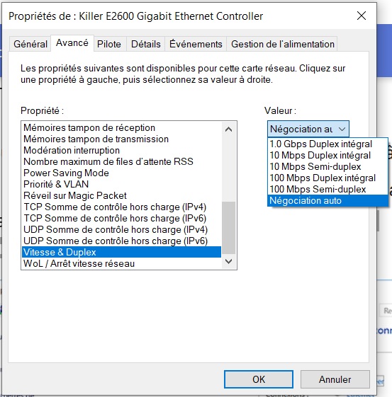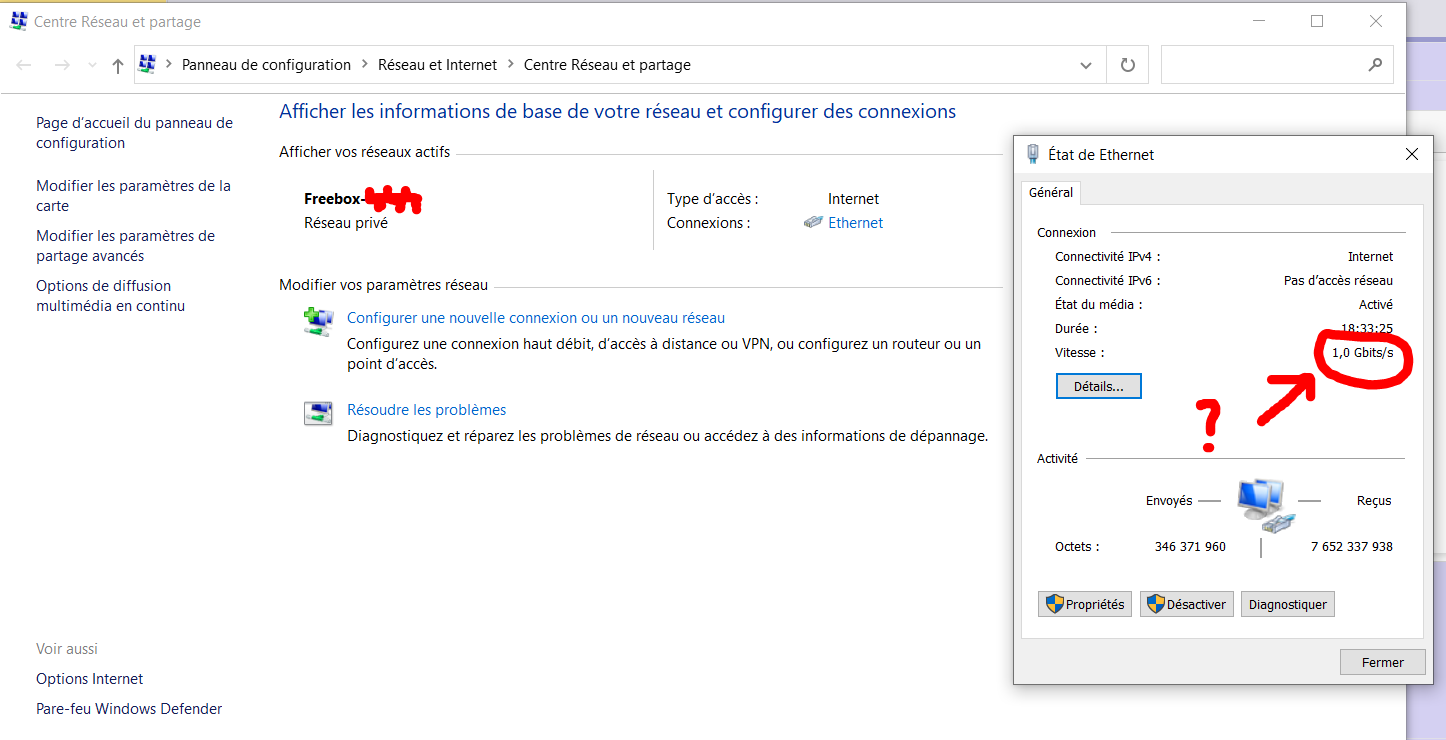 Coucou, j'ai constaté une lenteur de transfert entre mon pc et la Freebox, reliés par un cable Ethernet Cat6a. La carte mere de mon pc, une Gigabyte H87-HD3 qui possède un chipset "Realtek® GbE LAN chip (10/100/1000 Mbit)" qui autorise donc la connexion a 1Gbit, or je ne suis connecté qu'a 100Mbit